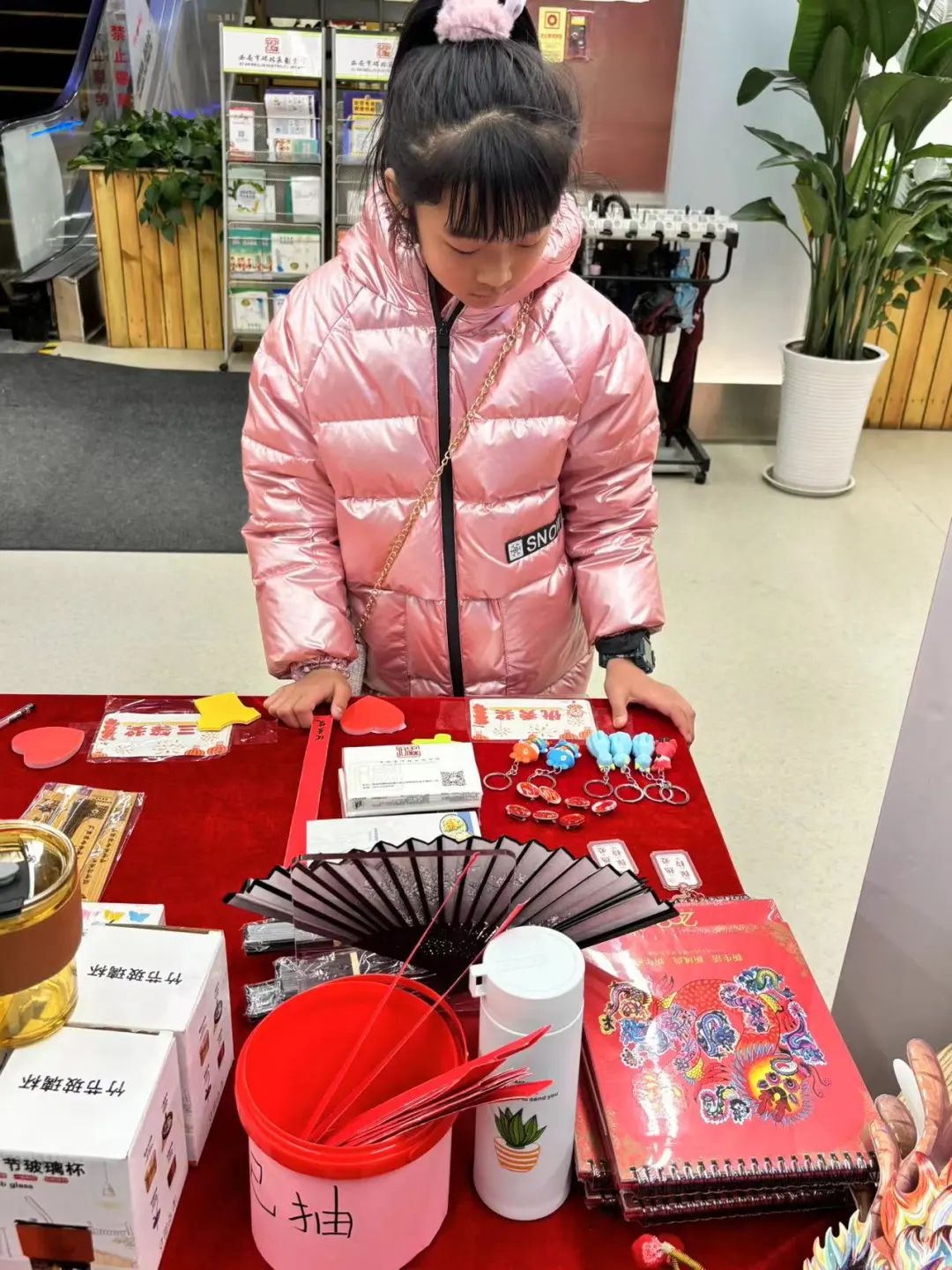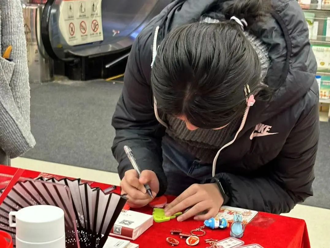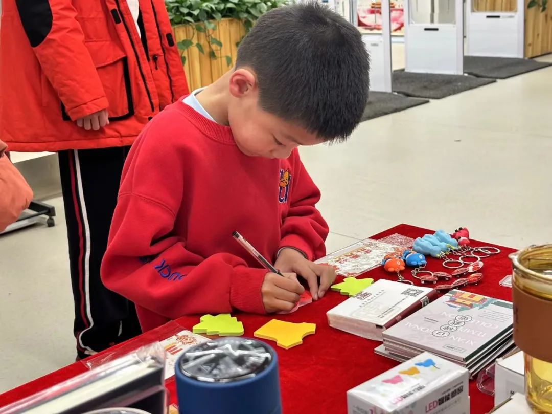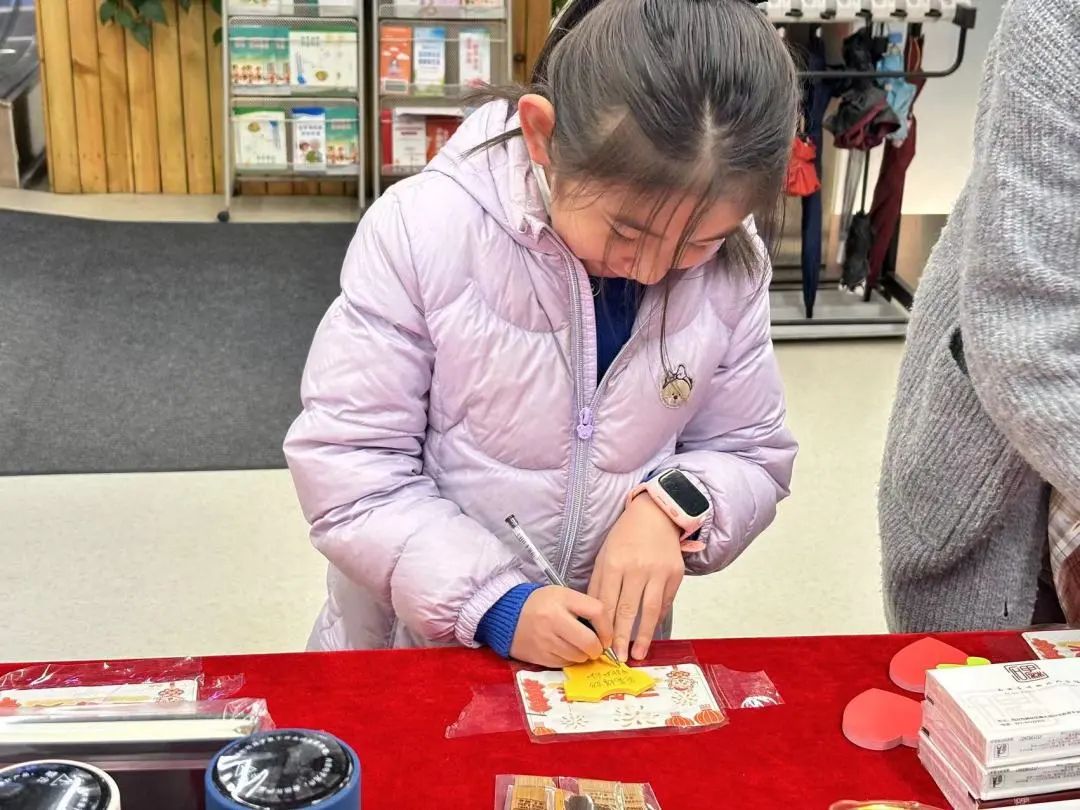 完成借阅书籍、写下新年愿望、与碑小图合影三项内容的读者都获得了抽奖机会。火红的台面上摆着数百个令人应接不暇的丰富好礼,碑图瓦当盏托文创、保温杯、笔记本、书签、小夜灯……让参与的读者们更添了一份欣喜与期待。