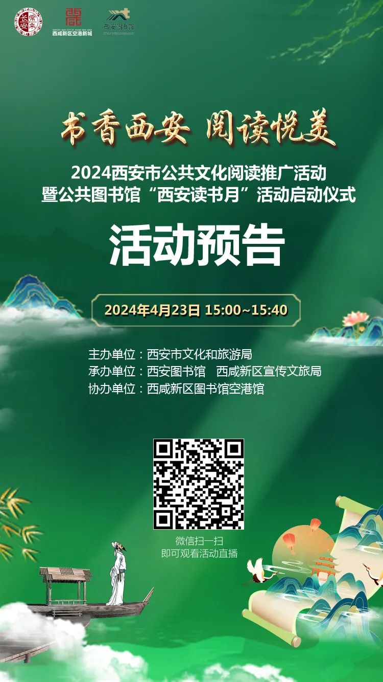 活动将于4月23日下午在西咸新区空港新城商务中心二期k区一层图书馆举行。届时,将发布全市各区县2024阅读推文活动信息,同时在西安图书馆微信公众号同步展示。仪式上将启动“关中城市平原城市群阅读推广联动”活动,并能欣赏到艺家歌舞团的《竹简舞》表演、古琴独奏《半山听雨》等精彩节目。此外,我们还邀请到阅读推广人姚伟娜发布读书倡议。整个启动仪式将以线下形式开展,线上同步视频直播、图片直播,全程配有手语翻译进行同步展示。让我们共同期待这个充满书香春日,一起感受阅读带来的美好。欢迎大家积极参与,共享阅读的快乐!