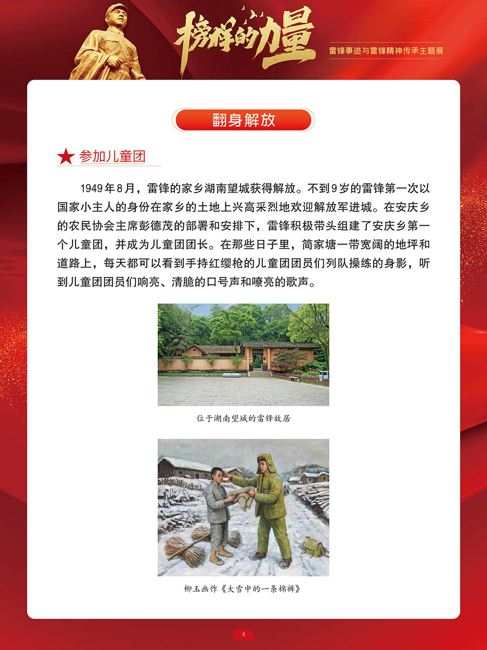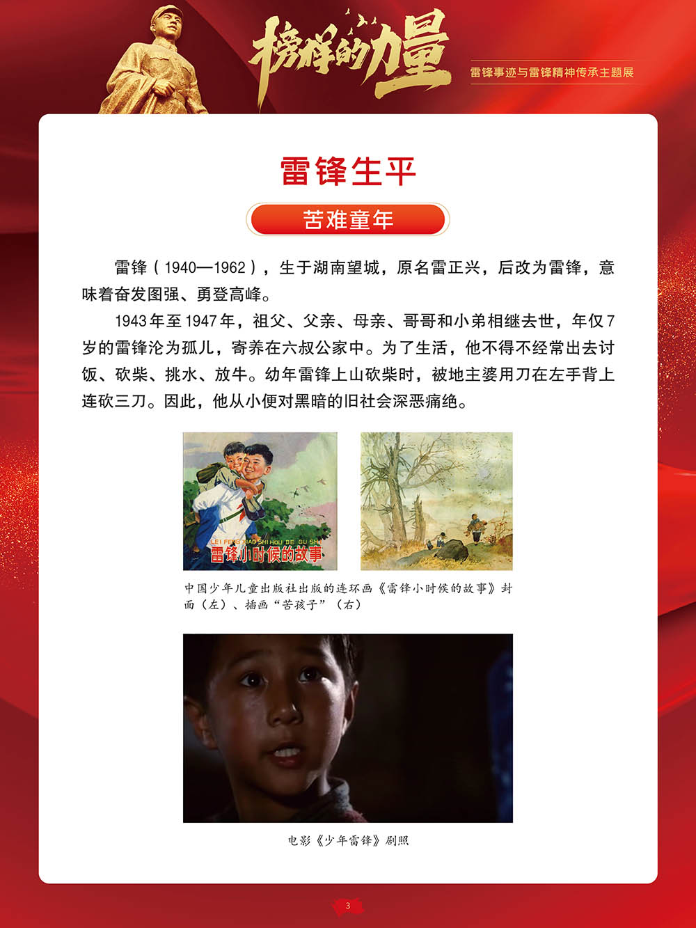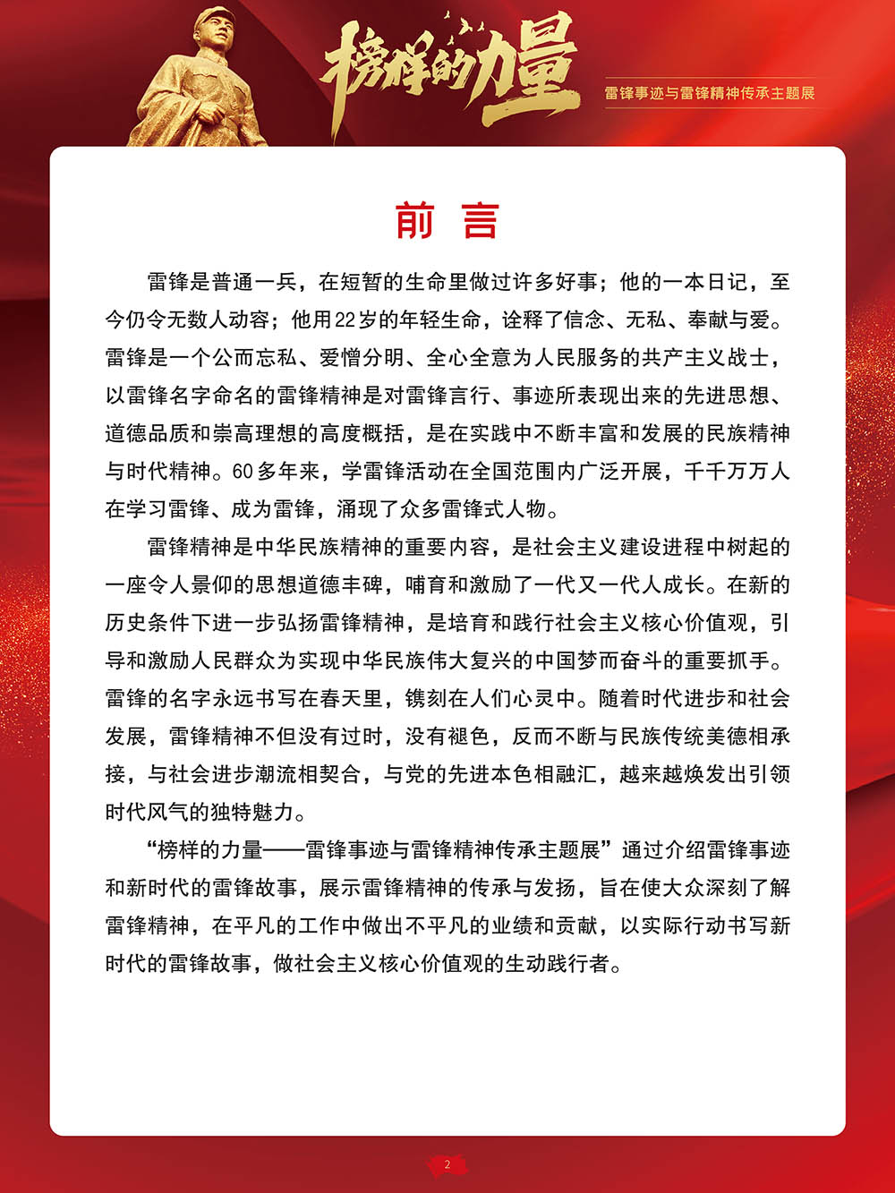 “榜样的力量——雷锋事迹与雷锋精神传承主题展”通过介绍雷锋事迹和新时代的雷锋故事,展示雷锋精神的传承与发扬,旨在使大众深刻了解雷锋精神,做社会主义核心价值观的生动践行者。