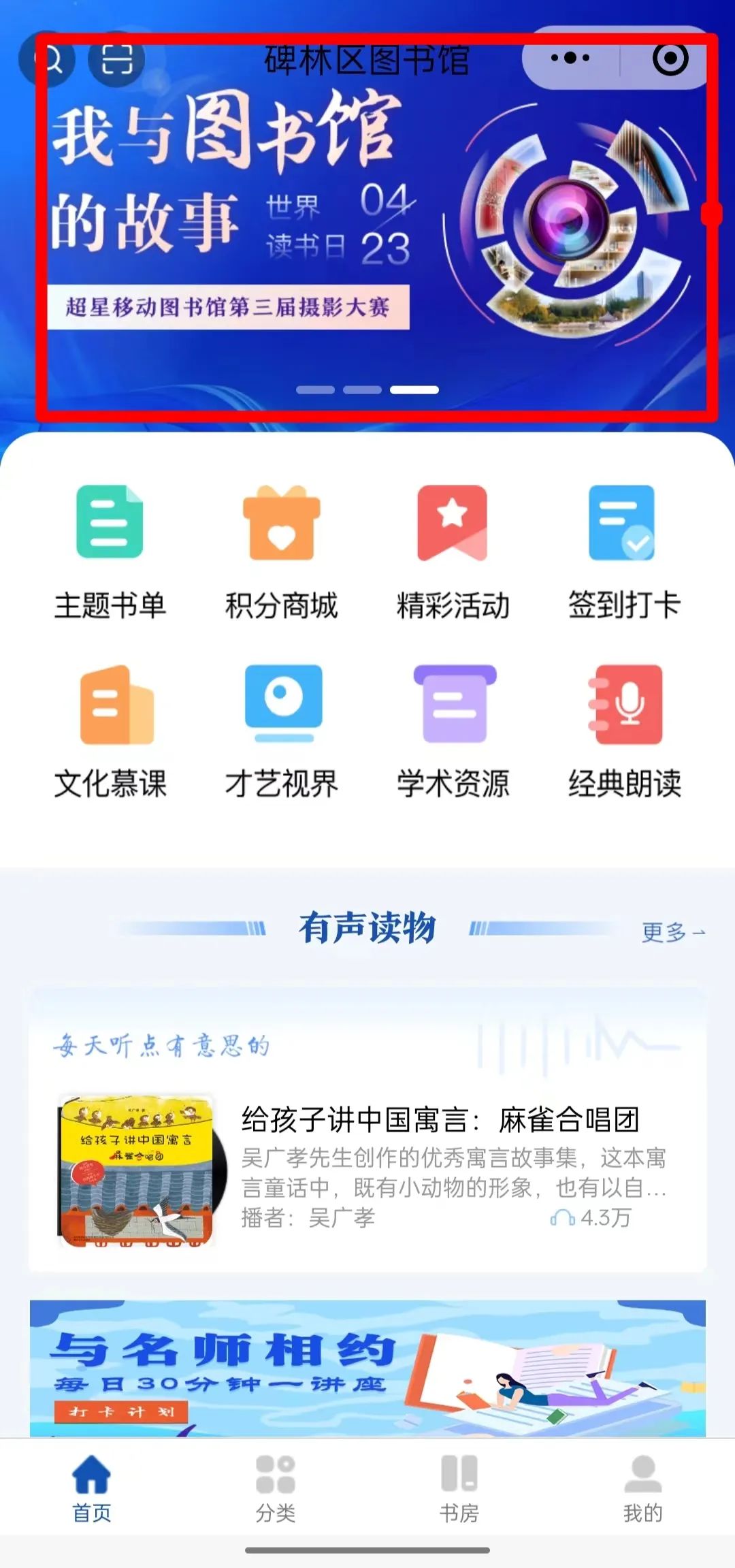 收费信息:免费“如果有天堂,那一定是图书馆的模样”,照片是定格最美好瞬间的载体,能直观展现图书馆的氛围与模样。“423世界读书日”是向全世界推广阅读和图书馆的重要日子,为培养读者良好的阅读习惯,营造书韵深厚的文化氛围,碑林区图书馆特举办移动图书馆摄影大赛活动。展现“我与图书馆”的美好瞬间,珍惜在图书馆读书的时光,用镜头讲述与图书馆的趣事,用镜头诠释与图书馆的不了情。