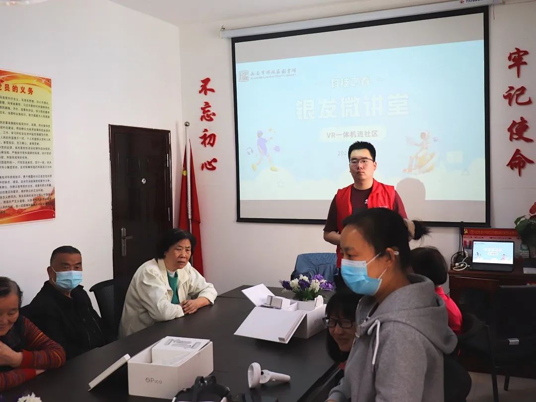 首先,图书馆的工作人员从VR一体机的功能特性、画面内容、佩戴方式等方面进行介绍,帮助老人了解VR设备。 在介绍完之后,许多老人对VR一体机感到好奇,纷纷表示想要体验。工作人员热情耐心地帮助老人佩戴VR设备,指导老人操作控制器。在体验过程中,工作人员密切关注老人的佩戴状态,询问其眼睛是否有不适感、能否清晰看到画面等等。 “哇太美了!”“感觉这个设备很棒!”在看到VR一体机中的各种精彩画面后,老人们高兴地发出赞叹。一位老人在看完美丽的星空后说:“我还想看看太阳是什么样子的”,于是工作人员指引她切换了画面,老人感到非常神奇。 本次“银发微讲堂”碑图带老年读者开启VR之旅活动受到了社区老人的一致好评,让老人们有了崭新的视觉体验,亲身感受到了科技的神奇。 “银发微讲堂”为老年人送来的是便利,开启的更是互联网时代下通往便利生活的大门。未来,碑林区图书馆将继续密切联系各社区,针对老年人在互联网时代中遇到的问题、难题,开展内容丰富的“银发微讲堂”系列活动,更好地满足老年群体的精神文化需求。 银发微讲堂 编辑:陈小苗