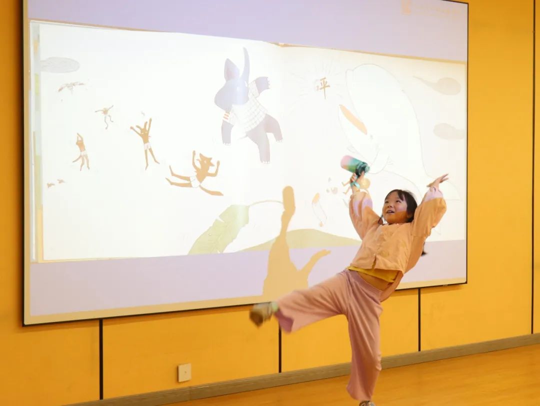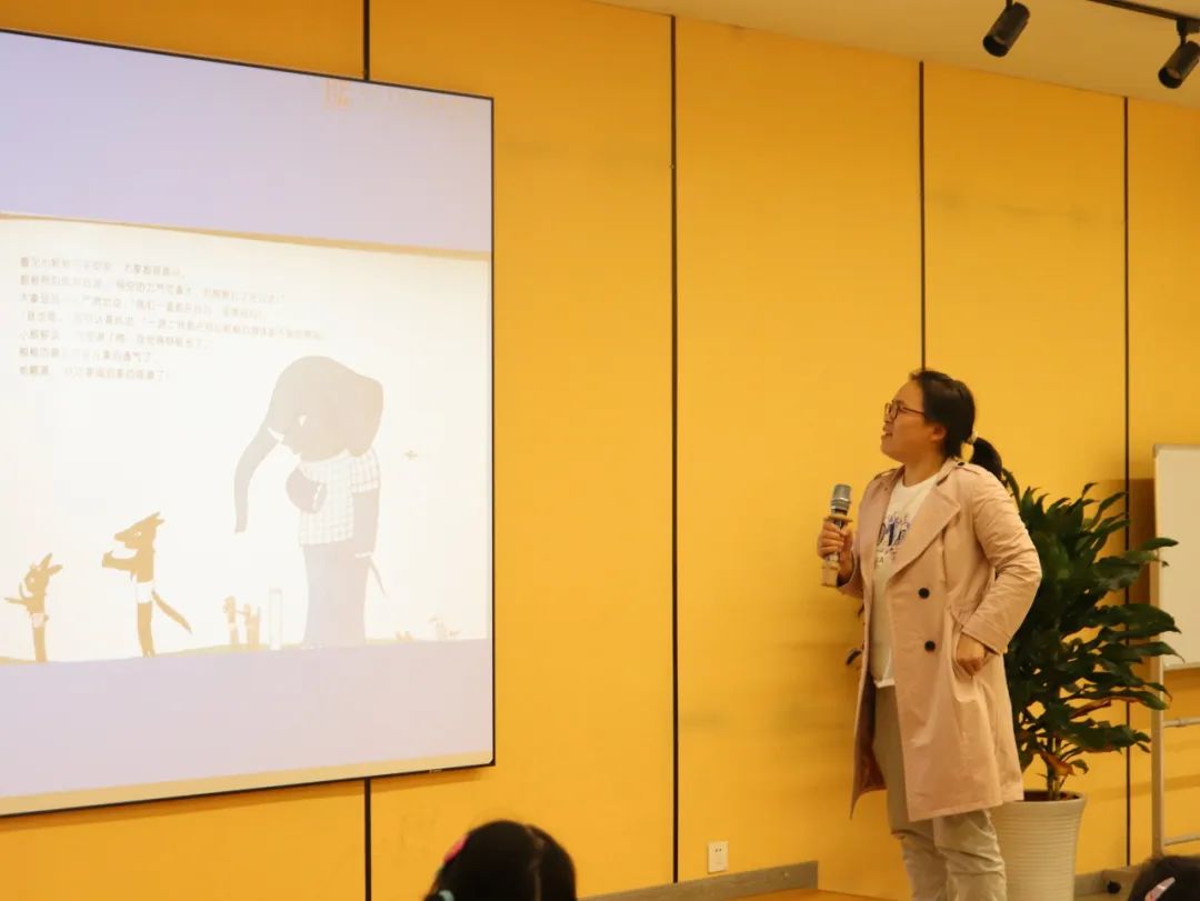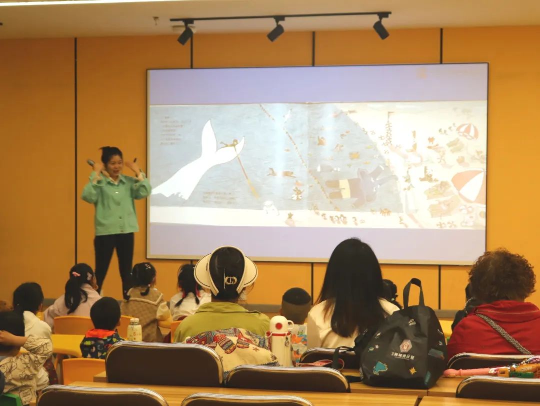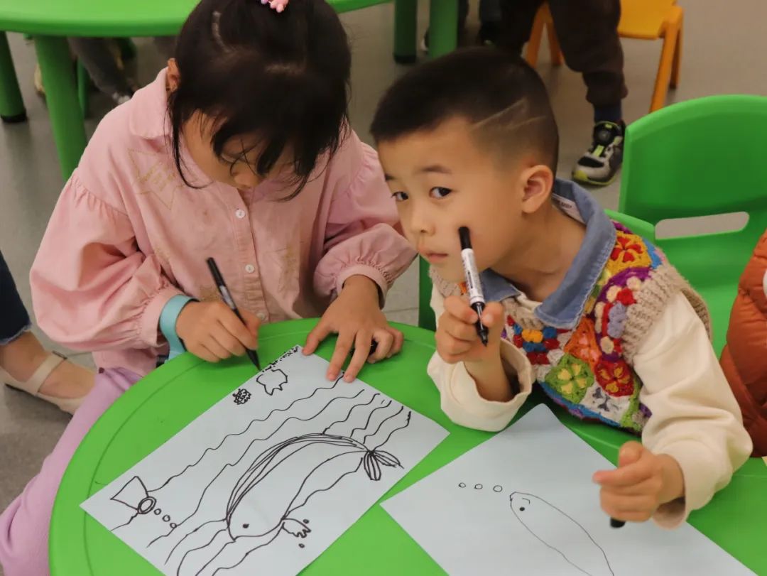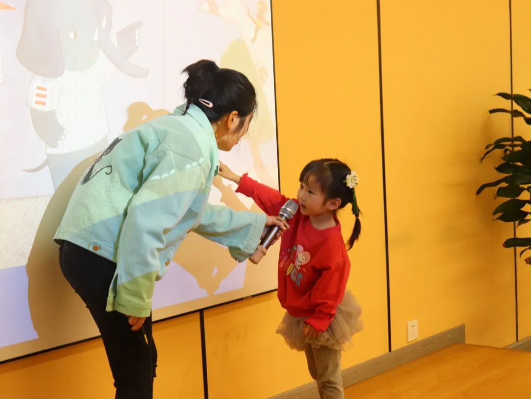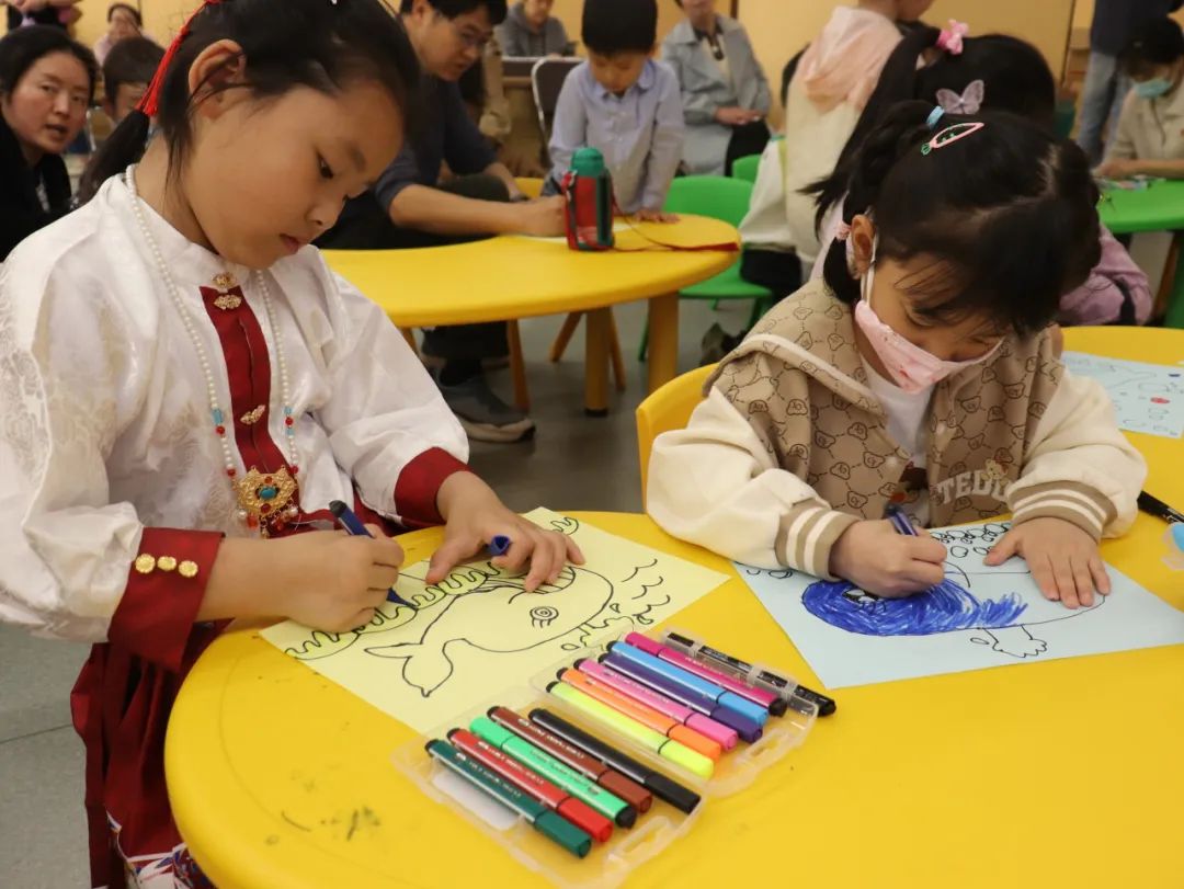 讲读期间,小林姐姐还邀请小朋友和家长上台演绎故事情节,并通过科普视频了解了鲸鱼的生活习性、生存现状等知识;在小林姐姐的引导下,小朋友们纷纷画下自己心中的“鲸鱼”模样,相互交流展示起来。