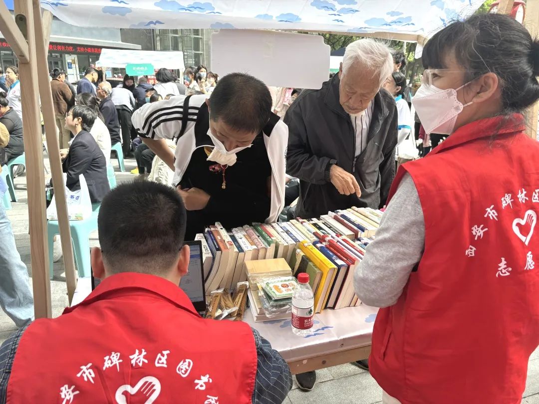 不少过往群众看到后,纷纷来到书桌旁选择自己喜爱的图书进行阅读;碑图还为现场借书的读者免费赠送了《读诗去》《断舍离》《厚黑学》等多本精美图书,以及书签、本子等文创,掀起了活动现场的阅读热潮。