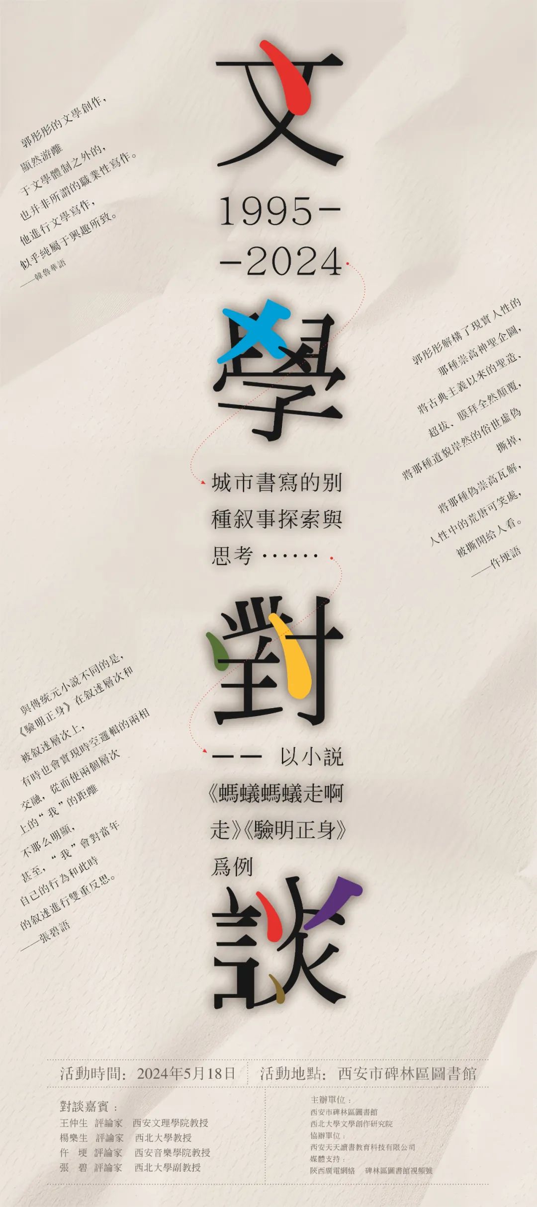 4位评论家将以郭彤彤的小说《蚂蚁蚂蚁走啊走》《验明正身》为例,通过文学作品的解读,和大家共同探索与思考城市书写的独特叙事方式。