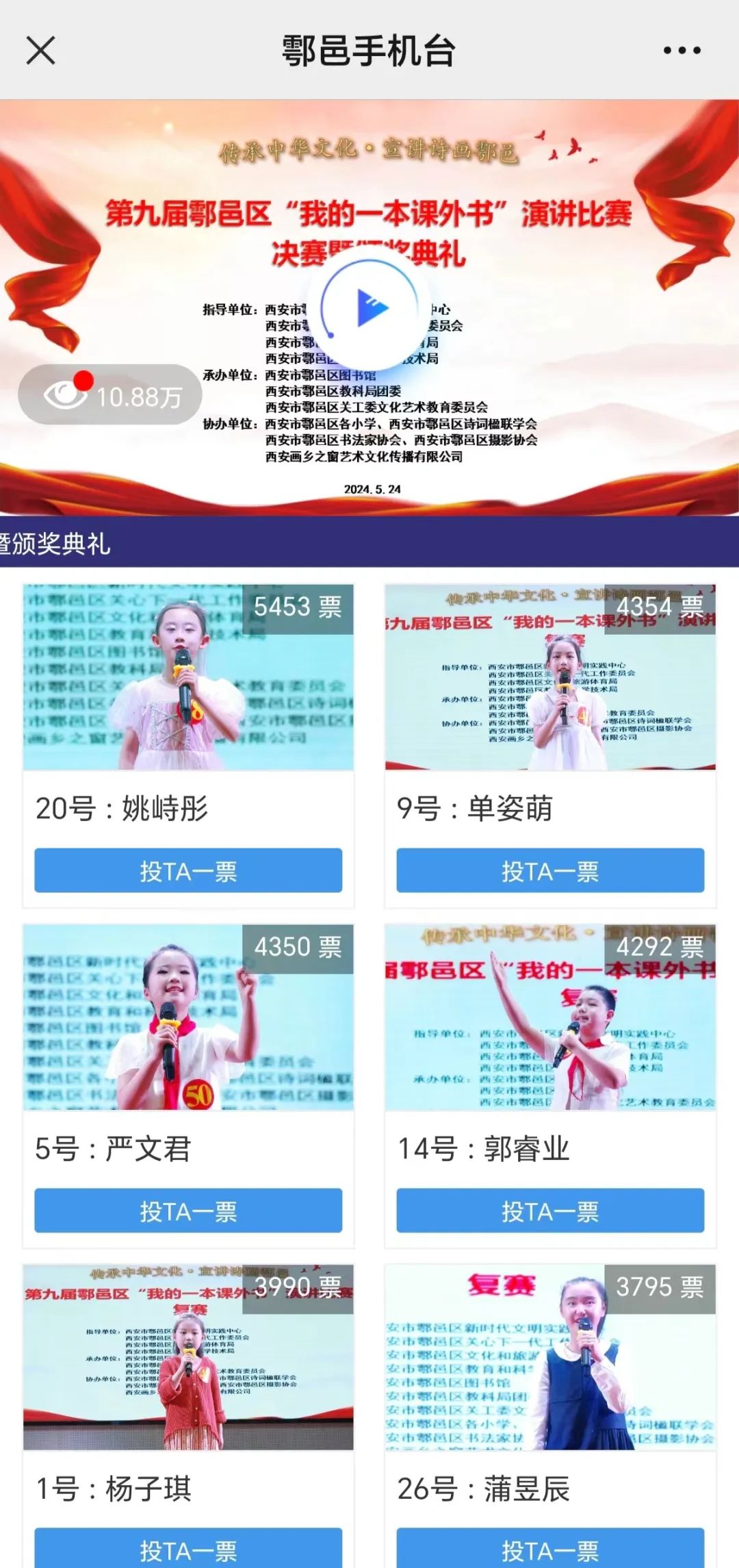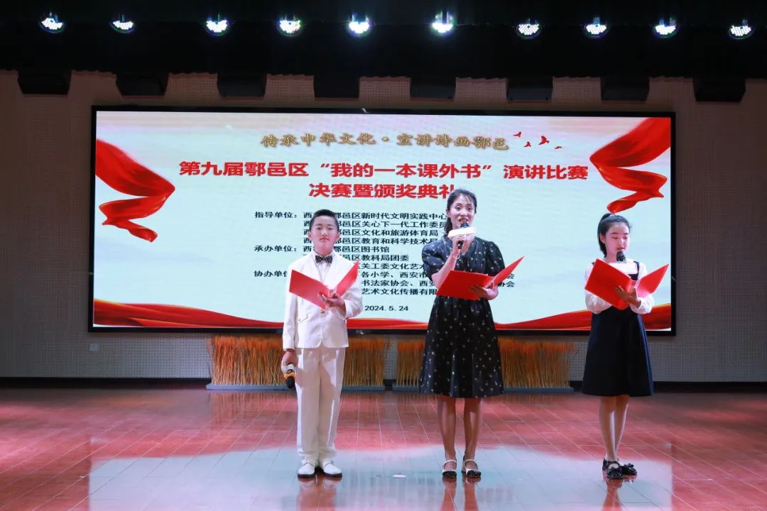 收费信息:免费“莫听穿林打叶声,何妨吟啸且徐行。竹杖芒鞋轻胜马,谁怕?一蓑烟雨任平生。苏东坡,一个耳熟能详的名字,一代家喻户晓的伟大诗人。”来自乡村学校西安市鄠邑区玉蝉中心校的六年级二班的赵乾岳同学让我们了解他眼中“老饕”——苏东坡…… “听爷爷说起那些宝贵的历史遗迹,是公输堂、是草堂寺、是重阳宫、是中楼等古建筑穿越历史长河,承载着丰富的文化内涵和深刻的时代印记。我最喜欢看书中色彩斑斓的农民画了......”来自西安市鄠邑新区小学三年级的田羽萱为大家讲述爷爷口中的美丽鄠邑;同时她唱响“你把咱的做饭锅卖了做啥,我嫌它打搅团爱起疙瘩。你把咱的小板凳卖了做啥,我嫌它坐着低不如蹲下。”讲述姥姥眼中的鄠邑传统戏曲《张连卖布》,让我们跟随她的脚步了解鄠邑本地地方文化…… 2024年5月24日,以“传承中华文化 宣讲诗画鄠邑”为主题的第九届鄠邑区“我的一本课外书”演讲比赛决赛暨颁奖典礼在鄠邑区文化中心如期举办。 比赛结束后,评委老师李欣从各位选手上场、仪态以及演讲内容、技巧方面进行点评:“经过复赛的培训,进入决赛选手在这三个方面都有很大的提升,尤其是在演讲内容方面,能从自己的情感历程出发,讲述出符合自身年龄特点的自己内心真情实感”;活动发起人王福来深情的说:“书籍是人类进步的阶梯。作为这项活动的初始倡导人之一,我们的初衷是吸引广大青少年读者走进图书馆,走近书籍,从小养成爱读书的习惯。历经十年九届,而今我们欣喜地看到,参与此项活动的学校和机构以及青少年同学越来越多,读后感演讲的水平越来越高,确实令人越觉‘初读不知文中事,再读已是文中人’了。希望这项活动能夠持久坚持,活动是个平台,评奖是种鼓励,我们的目的是让青少年读者在读书中吸取人生的精神和知识营养,成为传统文化的继承者、传播者,成为社会主义大厦的栋梁!” 本次比赛由鄠邑区新时代文明实践中心、鄠邑区关心下一代工作委员会、鄠邑区文化和旅游体育局、鄠邑区教育和科学技术局指导;鄠邑区图书馆、鄠邑区教科局团委、鄠邑区关工委文化艺术教育委员会联合承办;相关学校及鄠邑区诗词楹联学会、鄠邑区书法家协会、鄠邑区摄影协会协办,西安画乡之窗艺术文化传播有限公司现场直播;决赛现场聘请王福来老师、耿朝晖老师、陈海洲老师、石侃之老师、王占其老师、李欣老师、王皓勤老师担任本次比赛的评委。 本届比赛自3月开始启动,先后有20个单位参与海选,从1.79万名学生中遴选出88位优秀选手进行复赛,最终30位选手晋级总决赛。决赛分低、中、高年级三组进行,最终角逐出一等奖3名、二等奖6名、三等奖9名、优秀选手12名、网络人气奖10名。复赛11.59万人次和决赛10.88万人次网络直播观众合计22.47万人次。 同时,在比赛现场举办第九届鄠邑区“我的一本课外书”演讲比赛手稿入围作品展。 鄠邑区关工委主任、区政协原主席张萍同志;鄠邑区关工委常务副主任、区人大原副主任王明武同志;鄠邑区委宣传部副部长、区委文明办主任席方圆同志;区文旅局党委书记、局长杨峰同志;区关工委副主任兼秘书长、区教育局原党委书记丁昌民同志;区文旅局党委委员、副局长付文同志;区文旅局副局长薛彤彤同志;区教科局团工委副书记刘盼同志;区图书馆馆长张杰同志;区图书馆党支部书记孙晓勇同志等出席本次活动。