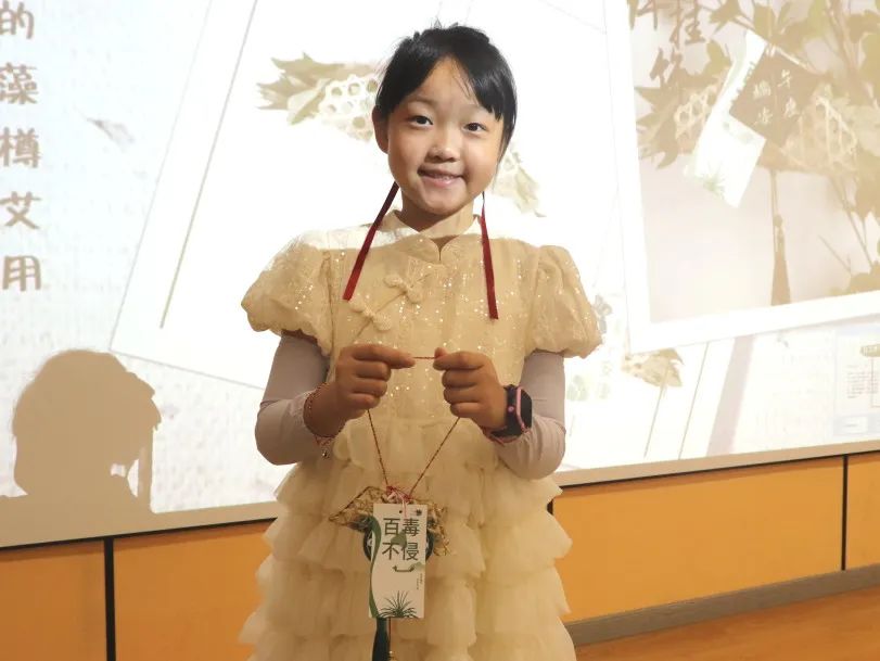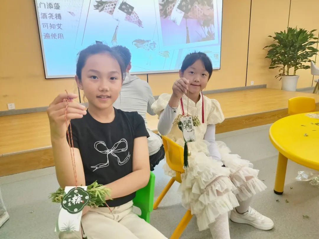 随后,孩子们在工作人员和志愿者的指导下,开始动手制作艾草菖蒲挂饰。艾草和菖蒲是端午节常见的植物,它们不仅具有驱邪避疫的寓意,还能为家中增添节日的氛围。孩子们认真“采摘”着工作人员递来的艾草、菖蒲叶子,将其用竹片包裹,再搭配彩绳、铃铛、卡片加以点缀,一个个充满节日氛围的艾草菖蒲挂饰就精美出炉了。