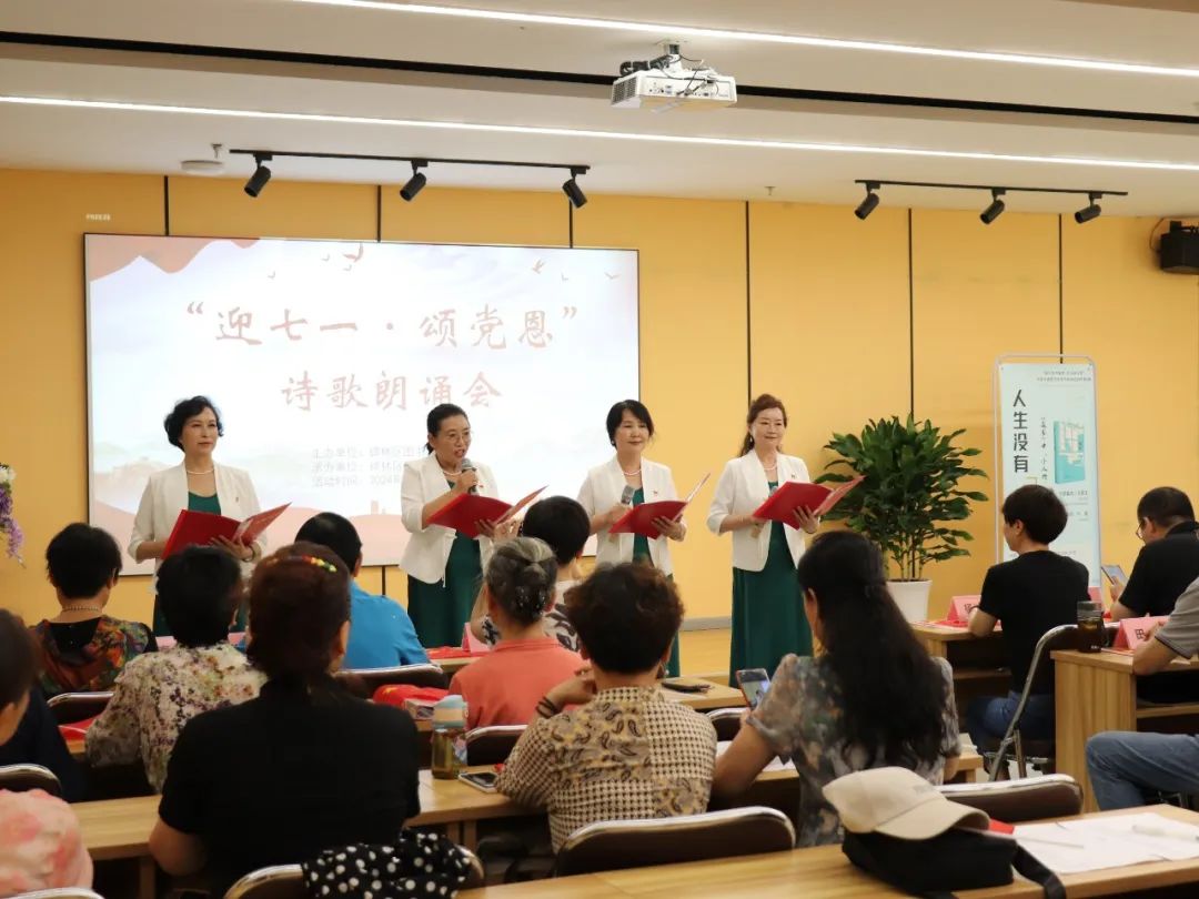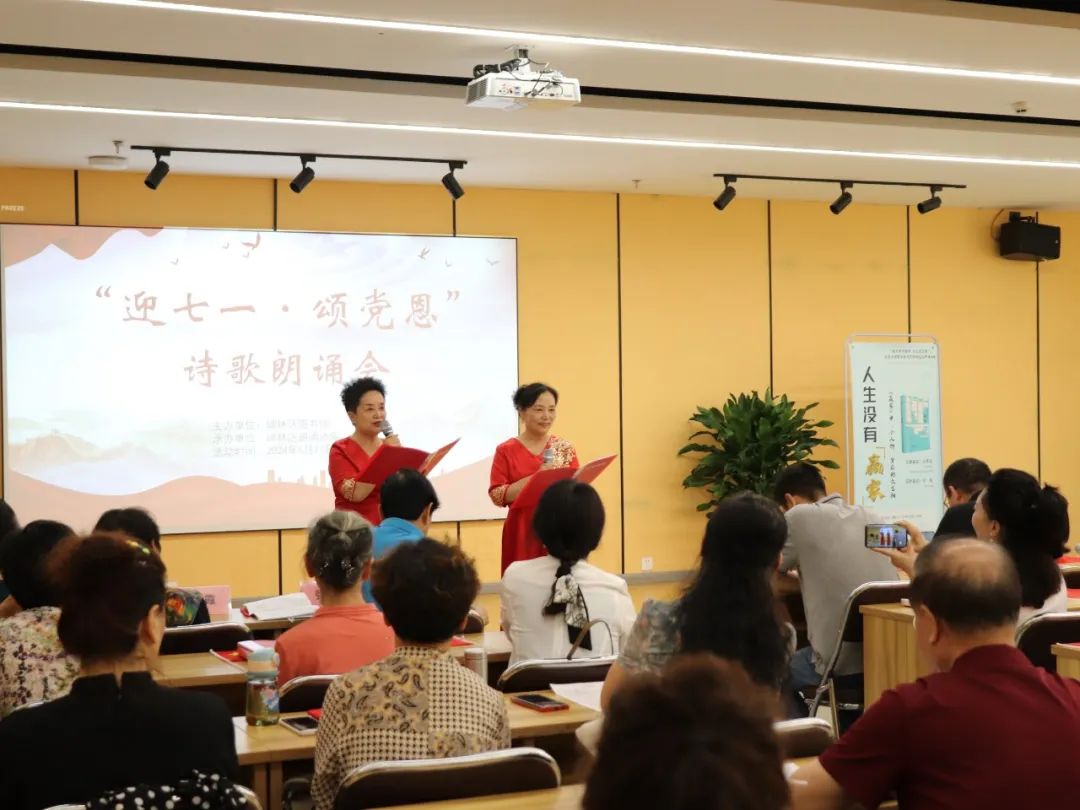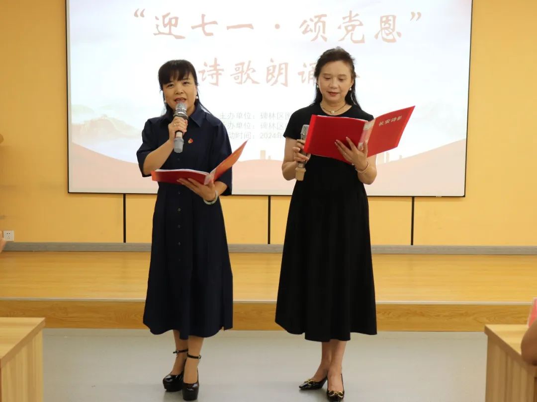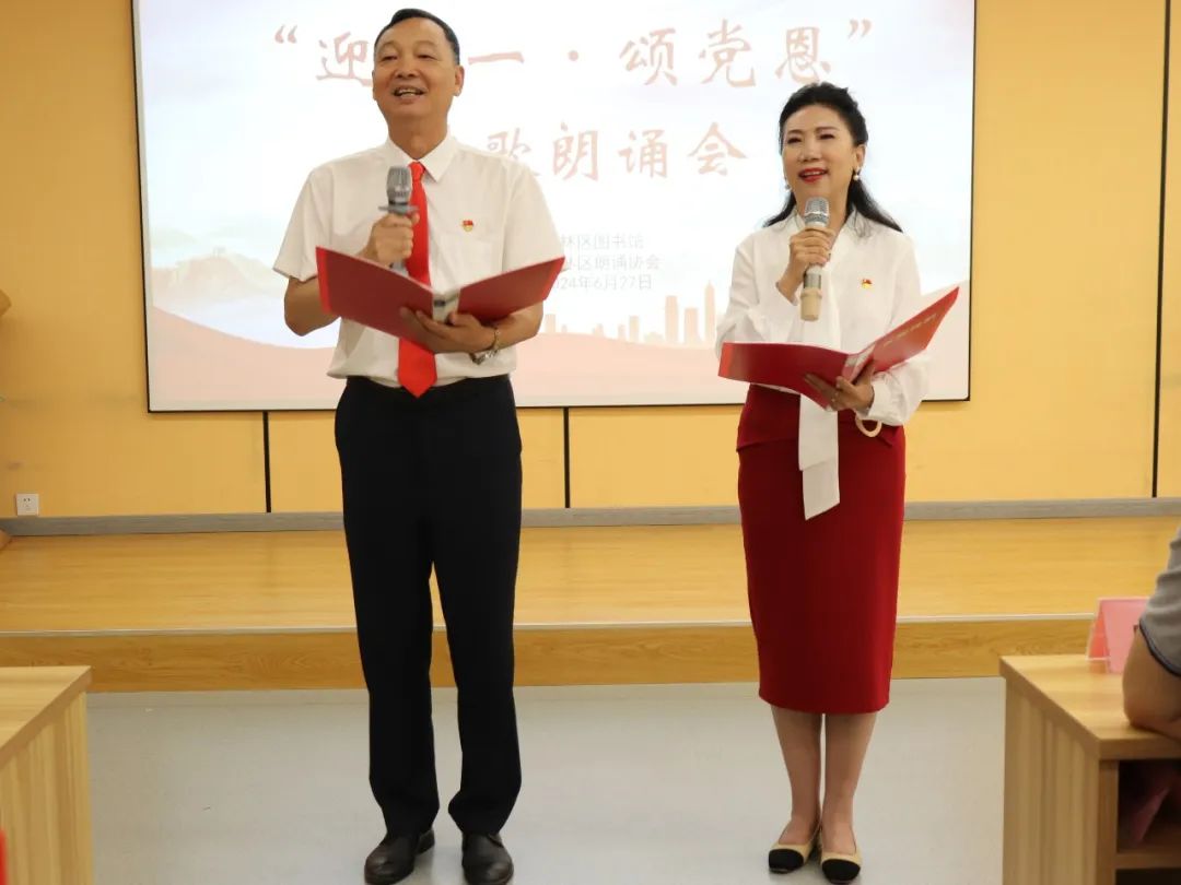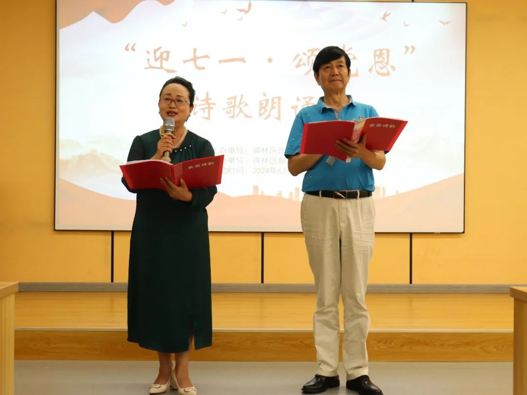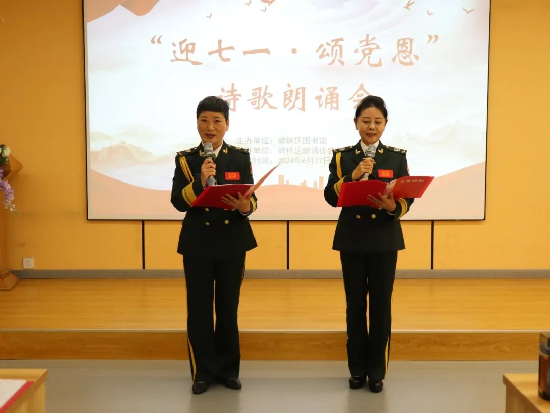 为庆祝建党103周年,回顾党的光辉历程,进一步继承和发扬党的光荣传统,6月27日上午,“迎七一·颂党恩”诗歌朗诵会在碑林区图书馆举办。碑林区朗诵协会名誉主席张全、碑林区朗诵协会主席吴静以及图书馆馆长肖海英等嘉宾和30位朗诵爱好者参与了本次活动。