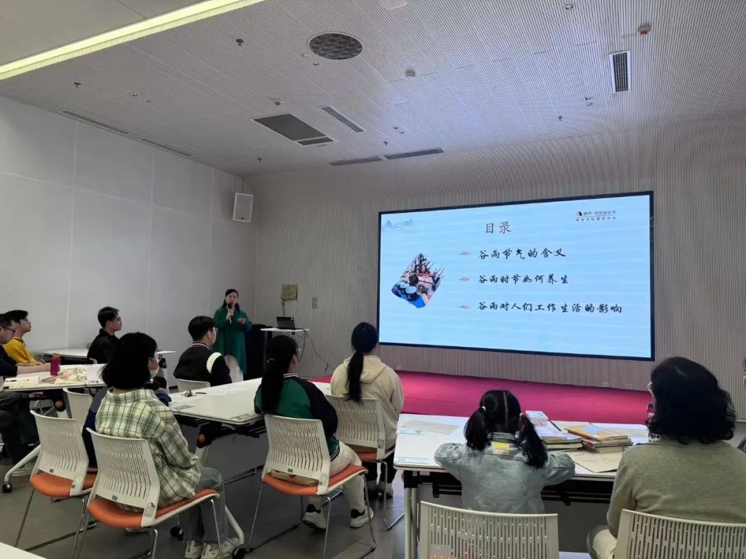 活动中,陈老师用图影并貌的形式,为大家讲解“谷雨”是中国传统文化二十四节气的第六个节气,也是春天最后一个节气,这也代表着春天即将结束,夏季即将到来,农民朋友们也即将开始种地,古谚“清明忙种麦,谷雨种大田”,谷雨传统习俗还有走春和喝谷茶、祭仓颉等。