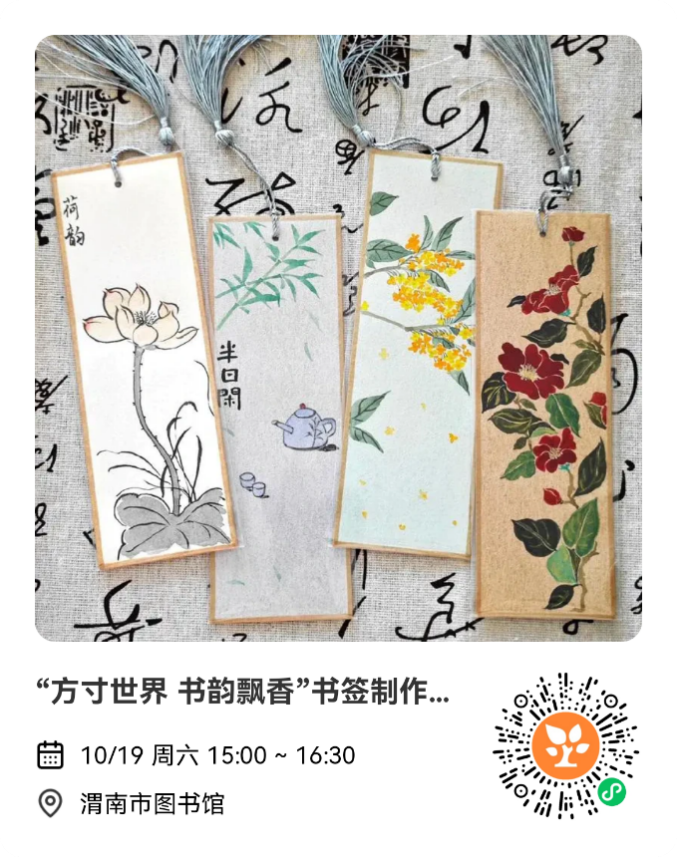 “方寸世界 书韵飘香”书签制作 2024年10月19日(周六) 15:00——16:30 渭南市临渭区六泉路中心西片多功能馆(渭南市图书馆) 1.签到入场。参加活动的读者签到后在工作人员处领取活动物料; 2.书签制作。发挥想象力在空白书签上进行书画制作,期间,工作人员将在场地内巡回指导,提供帮助; 3.亲子共绘。小读者可以和家长共同创作,完成作品; 4.合影留念。 1.现场报名:一楼总服务台 2.电话报名:樊老师 2028303 3.二维码报名