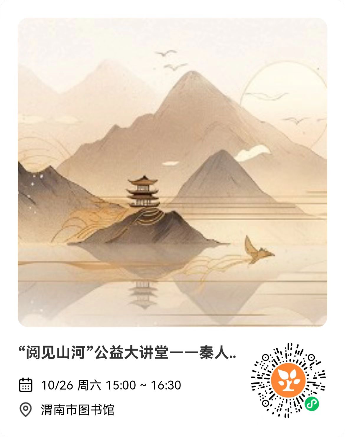 追溯秦史,品味渭南 10月26日(周六) 15:00——16:30 渭南市多功能馆负一层会议室 所有读者 邀请渭南作协专家进行“秦人讲渭南”主题讲座,详细讲述渭南的政治、经济、文化、军事等方面的情况,以及重要历史事件和人物。 1.签到入场 2.聆听讲座 3.作家签名 4.合影留念 1.现场报名:一楼总服务台 2.电话报名:樊老师 2028303 3.二维码报名 2024.10.21 渭南市图书馆