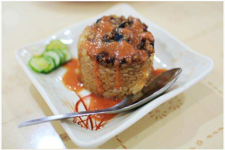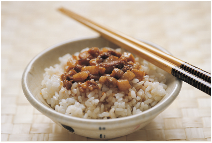 台湾早期物资贫乏,人们常把肉贩不要的猪皮、肉碎用酱油卤成一锅,制成咸甜入味、肥而不腻、浓香四溢的卤肉,盖在米饭上,再烫几棵小青菜,浇上几勺卤肉和汤汁,拌匀后,每一粒米都吸透了黑红的汤汁,细品轻尝,唇齿留香,回味无穷。