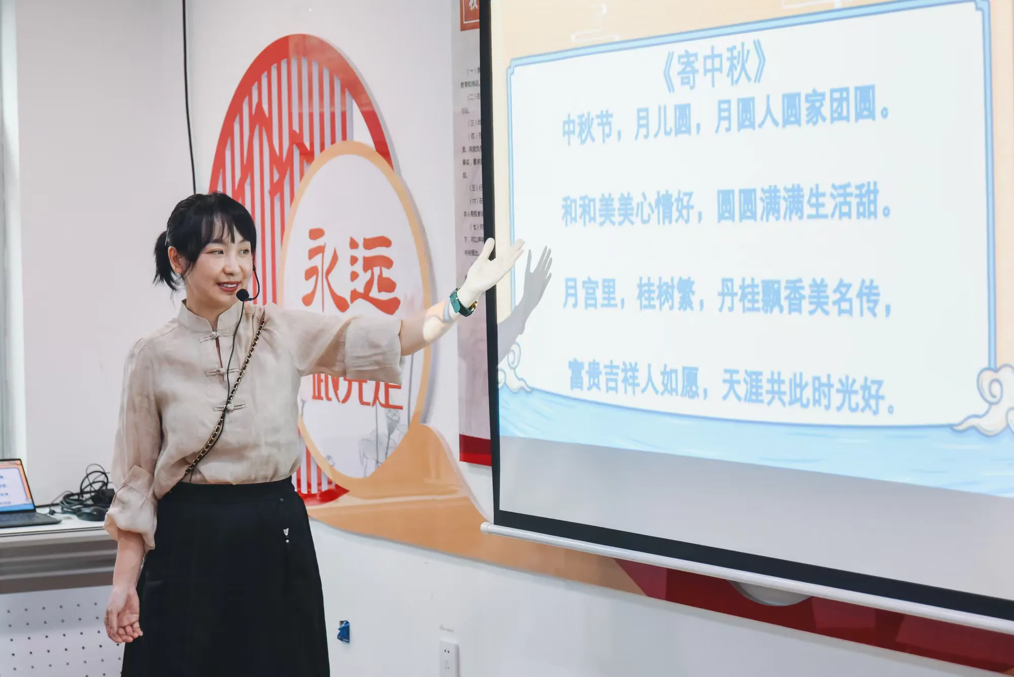 活动伊始,以童谣《寄中秋》正式拉开序幕:“中秋节,月儿圆,月圆人圆家团圆。和和美美心情舒畅,圆圆满满生活甜美。月宫之中,桂树葱郁,丹桂之香,美名远扬。富贵吉祥,人心如愿,天涯共此时,时光美好。”此首原创童谣,旋律优美,节奏明快,孩子们在心宇老师的引领下,通过歌词领略了中秋佳节的美好寓意。
