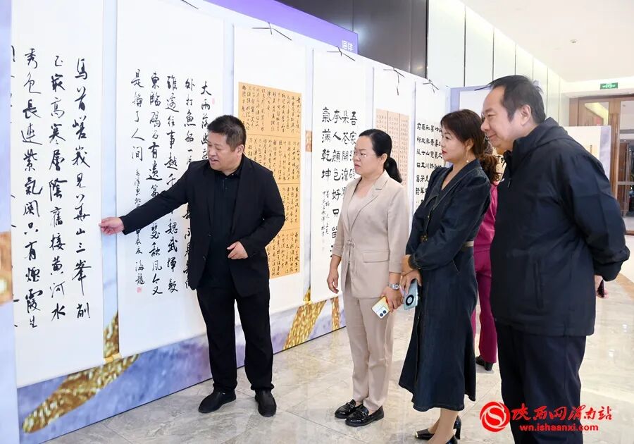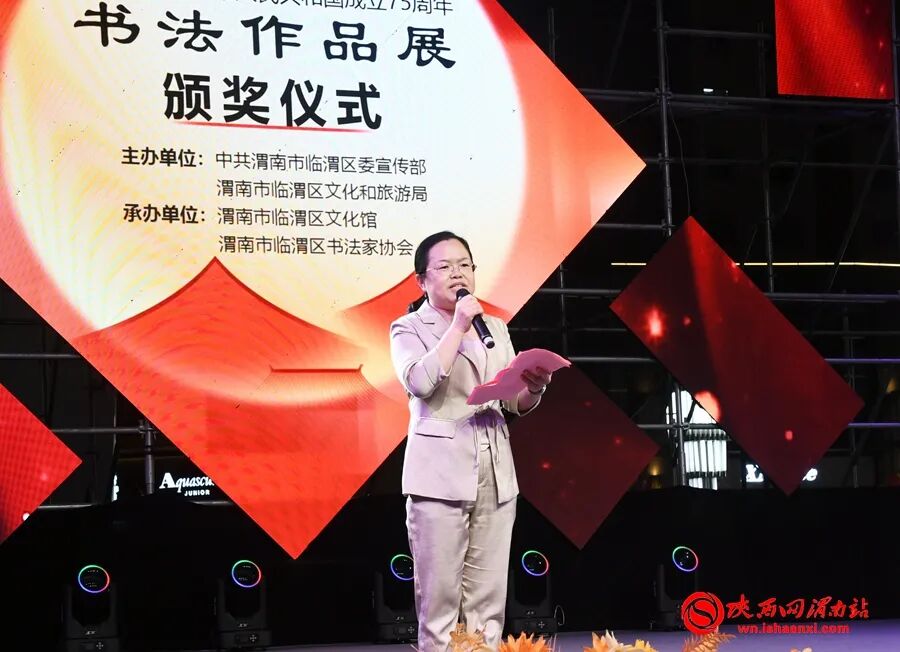 临渭区委宣传部副部长、新时代文明实践中心主任吴涛,临渭区文化和旅游局副局长田春侠,临渭区文化馆馆长、区非遗保护中心主任钟娟,临渭区书法家协会主席史建军,渭南吾悦广场总经理张琪等参加颁奖典礼。田春侠在致辞中说,此次书法作品展是临渭区书法界的一次盛会,也是全区人民献给中华人民共和国成立75周年的厚礼。展览中的每一幅作品,都凝聚着作者对祖国的热爱、对美好生活的向往和对传统文化的敬仰。希望通过本次书法作品展,进一步弘扬中华民族优秀传统文化,让更多人感受到书法艺术的魅力,在全区营造浓厚的文化氛围,推动书法艺术在临渭区传承与发展。同时,也希望以书法为媒介,增进群众对新中国发展历程的深入了解,激发爱国热情和民族自豪感,鼓励大家在各自的岗位上为实现中华民族伟大复兴的中国梦贡献力量。