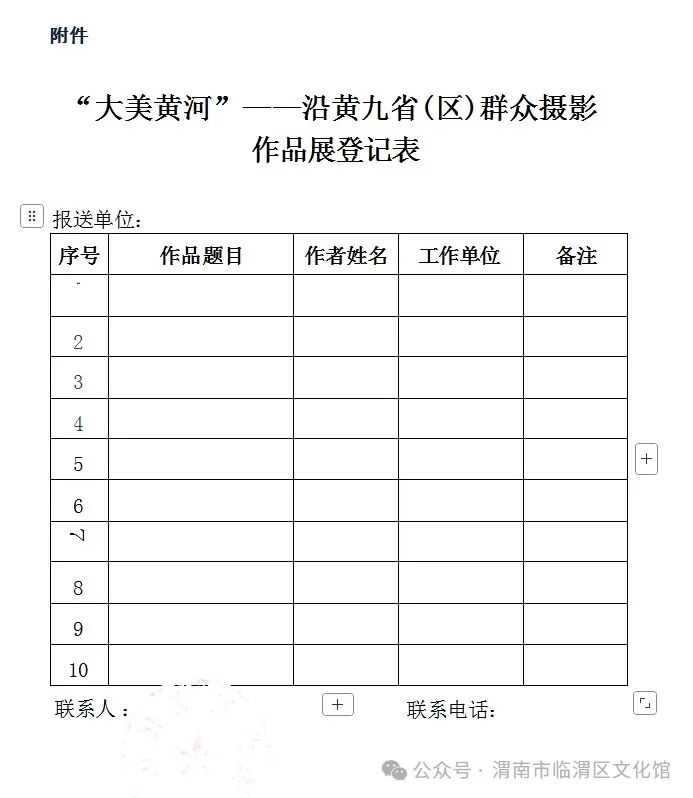 陕西省文化馆关于 开展“大美黄河”——沿黄九省(区)群众 摄影作品展作品征集工作的通知 各市群众艺术馆(文化馆、文化艺术中心)、韩城市文化馆、杨 陵区文化馆: 根据《山东省文化和旅游厅关于举办“大美黄河”——沿黄 九省(区)群众摄影作品展的函》要求,山东省文化和旅游厅定 于2025年9月在山东省举行“大美黄河”——沿黄九省(区) 群众摄影作品展,现面向沿黄九省(区)开展摄影作品征集。为 做好我省作品征集工作,现将征集工作相关安排通知如下。 一、组织机构 ( 一)主办单位 山东省文化和旅游厅 山西省文化和旅游厅 河南省文化和旅游厅 四川省文化和旅游厅 陕西省文化和旅游厅 甘肃省文化和旅游厅 青海省文化和旅游厅 宁夏回族自治区文化和旅游厅 内蒙古自治区文化和旅游厅 (二)承办单位 沿黄流域九省(区)文化馆联盟(青海省文化馆、四川省文 化馆、甘肃省文化馆、宁夏回族自治区文化馆、内蒙古自治区文化 馆、山西省文化馆、陕西省文化馆、河南省文化馆、山东省文化馆) (三)执行单位 山东省文化馆、山东省群众文化学会、山东省艺术摄影学会 二、展览时间 2025年9月下旬至10月底 三、展览地点 山东省文化馆展厅 四、作品及展览要求 (一)征稿范围 沿黄九省(区)文化馆摄影工作者,群众摄影爱好者。 (二)作品要求 1.反映黄河流域生态保护和高质量发展中的辉煌成就,展现 黄河流域的自然风光、生态保护、经济建设、人文风情等,主题 鲜明、思想精深、艺术精湛、制作精良相统一的摄影作品。 2. 投稿作品须为原创,JPEG 格式,不小于5M的高品质电子 文件。黑白、彩色不限,单幅、组照均可(组照限6幅以内)。 每件作品的文件名以“作品名称+作者姓名+单位+联系方式+150 字说明”命名。 3.各市群艺馆(文化馆、文化艺术中心)、韩城市文化馆、 杨陵区文化馆各报送电子作品10件,每位作者限报1件。 五、时间安排 (一)请各市群艺馆(文化馆、文化艺术中心)、韩城市文 化馆、杨陵区文化馆认真组织作品征集工作,并于8月10日前 将推荐作品电子版和《作品展登记表》(见附件)以压缩文件夹 格式统一发送至邮箱:3490743750@qq.com, 压缩文件夹名称为 “市(区)+大美黄河摄影作品展”。 (二)8月中旬,陕西省文化馆组建专家委员会,对我省报 送的摄影作品进行初评,从中遴选优秀作品40件推荐参展。 (三)9月初,山东省文化馆组织专家进行复评,遴选优秀 作品集中展出。9月下旬,在山东省文化馆举行“大美黄河”— — 沿黄九省(区)群众摄影作品展开幕式。11月,主办单位组 织安排各省(区)巡展。 六、其他事宜 (一)投稿人应保证其所投送的作品不侵犯第三者的包括著 作权、肖像权、名誉权、隐私权等在内的合法权益。凡因稿件或 投稿行为所产生的责任、纠纷均由投稿人自负。 (二)主、承办单位对入展作品有展览、研究、摄影、录像、 出版及宣传权。 (三)经评选后展出的作品由山东省文化和旅游厅颁发优秀 奖证书,对优秀组织者颁发优秀组织奖证书。 (四)在山东省文化馆展览结束后将组织省内、外巡展活动。 (五)凡入展作品,应视为已确认并遵守本方案的各项规定。 陕西省文化馆 2025年5月12日