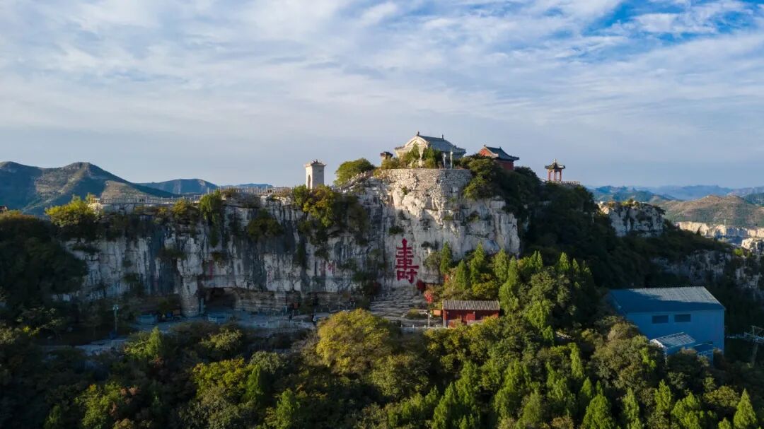 片刻我们爬到半山望寿阁,在这里小憩,山顶石壁上的大红寿字已历历在目。回望山下,街市远退,田园如织。再鼓余勇,直迫山顶,这时再仰观那寿字,犹如一艘多桅巨船,挟云裹雾,好像就要压到头上。同行的一个小伙子贴身字上,还没有寿下“寸”字的一竖高。这是世界上最大的寿字,是书法的精品、极品,日本的书道专家还常渡海西来顶礼膜拜呢。这是明代嘉靖三十九年,青州衡王为自己祝寿时所刻,距今已四百多年。