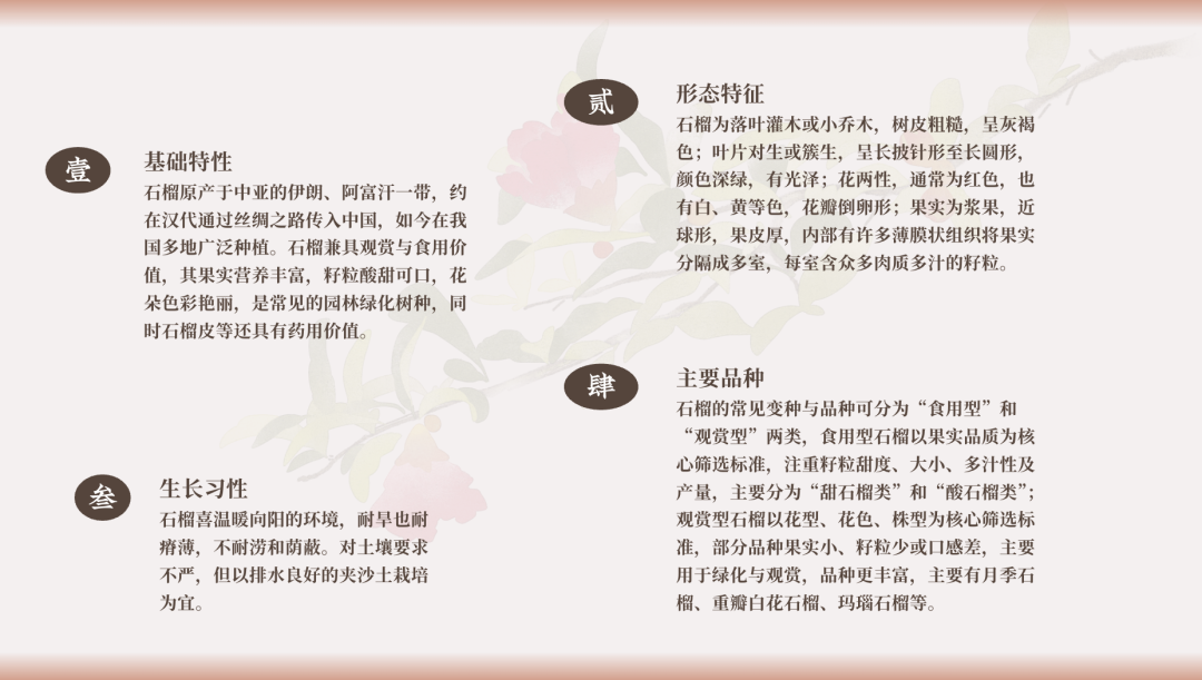 “榴枝婀娜榴实繁,榴膜轻明榴子鲜。”一颗石榴,从西域古道辗转而来,在华夏大地扎根千年。它不争春色,却在盛夏燃起如火繁花,秋日捧出晶莹子实。以“千房同膜”之态,凝成“百子团圆”的家族祈愿;以“丹心映火”之姿,化作诗词画作中的吉祥符号。今日,让我们循红探榴,看这一枚异域珍果如何融入中华文化的血脉。 植物档案 草木中国 文化溯源 草木中国 西汉至唐代:丝路馈赠 石榴原产中亚,据《博物志》等记载,为汉代张骞出使西域后作为“胡果”之一沿丝绸之路传入中原,故初名“安石榴”。汉武帝时期,石榴被栽植于上林苑,成为皇家园林的珍稀物种。到了唐代,石榴栽培逐渐普及,长安城内私家园林、寺庙道观多植石榴,寓意“多子多福”。唐代诗人对石榴情有独钟,写下了大量咏榴佳作。李白的“星火五月中,景风从南来。数枝石榴发,一丈荷花开。”描绘了五月石榴绽放、与荷花相映成趣的夏日美景;白居易的“春芽细炷千灯焰,夏蕊浓焚百和香。”则以比喻的手法,将石榴花比作千灯焰、百和香,凸显其艳丽与芬芳。 宋元至明清:民俗融合 宋代,石榴文化进一步深化,除了“多子多福”的寓意外,还衍生出“金玉满堂”的吉祥含义,因石榴果皮鲜红似火,籽粒晶莹如珠玉,象征着财富与吉祥。此外,宋代的绘画作品中也常以石榴为题材,展现其独特的美学价值,尽显生机与活力。明清时期,石榴纹饰广泛应用于建筑、服饰、瓷器等领域,如故宫中的“石榴抱子”窗棂、景德镇青花石榴纹瓶,均寄托着人们对家族兴旺、国家统一的美好期盼。 近现代至今:生活美学 近现代以来,石榴的种植范围进一步扩大,除中原地区外,在南方的云南、四川、广东等地也有大量栽培。同时,石榴的品种不断改良,出现了甜石榴、酸石榴、观赏石榴等多个品种,满足了人们不同的需求,其文化寓意也一直延续至今,成为中华民族传统文化中极具代表性的吉祥符号。如今,石榴已成为“一带一路”文化交流的使者,新疆、陕西等地的石榴远销海外,让世界品味中华果香的醇厚。 文化印记 草木中国 文学艺术 诗词领域:中国历代咏石榴诗多赞其花红似火、子实晶莹。唐代韩愈《题张十一旅舍三咏·榴花》中“五月榴花照眼明,枝间时见子初成。”写尽榴花灼灼、果实现形的生机;元代张弘范《咏石榴》中“猩红敢教染绛囊,绿云堆里润生香。”以“猩红”“绿云”对比,凸显石榴花的艳丽。 绘画领域:在绘画领域,石榴一直是画家们青睐的题材之一,不同朝代的画家以各自独特的风格,创作出了众多经典的石榴画作。明代画家徐渭擅长画水墨石榴,其作品《榴实图》以奔放洒脱的笔触,描绘了一颗饱满的石榴,果皮破裂,籽粒外露,仿佛能让人闻到石榴的清香,尽显石榴的生机与活力。 实用价值 食用价值:石榴的果实具有极高的食用价值,石榴籽酸甜多汁,富含维生素C、钾等营养成分,可鲜食或榨汁,石榴酒、石榴汁、石榴果醋等制品广受欢迎。 观赏价值:石榴树形古朴,春夏花红似火,秋季果实缀枝,兼具观花、观果之趣。适于庭院孤植、盆栽造景,亦常见于园林山石配植,象征“红火兴旺”。 赏景漫游 草木中国 临潼石榴园(陕西西安) 临潼是中国历史悠久的“石榴之乡”,种植石榴的历史可追溯至汉代,距今已有两千多年。每到五月,石榴花盛开,整个园区一片火红,宛如一片红色的海洋,吸引众多游客前来观赏;到了九月、十月,石榴成熟的季节,沉甸甸的果实挂满枝头,游客可以亲手采摘石榴,品尝新鲜的石榴籽粒,感受丰收的喜悦。 怀远石榴基地(安徽蚌埠) 怀远石榴以“皮薄、粒大、味甜”著称,为国家地理标志产品。秋日来访,可沿荆山湖石榴基地漫步,看累累硕果压弯枝头,品尝鲜榨石榴汁、石榴酒,感受“水晶为粒玉为浆”的滋味。 叶城石榴风情园(新疆喀什) 叶城位于新疆喀什地区,是新疆知名的“石榴之乡”。这里的石榴受充足光照与昼夜温差影响,糖分积累高,口感极佳。游客可在石榴风情园中,欣赏维吾尔族歌舞,品尝石榴汁、石榴馕等特色美食,感受丝路瓜果的甜蜜与民族文化的交融。 一缕榴红,自丝路驼铃燃至万家灯火;万子同房,把异域的甘甜酿成乡土的祝福。从长安御苑到河谷梯田,石榴以赤焰之色、珠玑之味,在每一个秋天裂开笑颜,将“多子、多福、多寿”的华夏愿景,种进岁月,落地生根。 内容来源:《博物志》《中国植物志》、中华人民共和国农业农村部、中国科学院植物研究所、故宫博物院、陕西省文化和旅游厅、安徽省农业农村厅、怀远县人民政府、叶城县人民政府。 本文用于公益宣传,部分图片来源网络,版权归原作者所有,如有侵权请联系删除。 -完- 往期回顾 岐山县图书馆