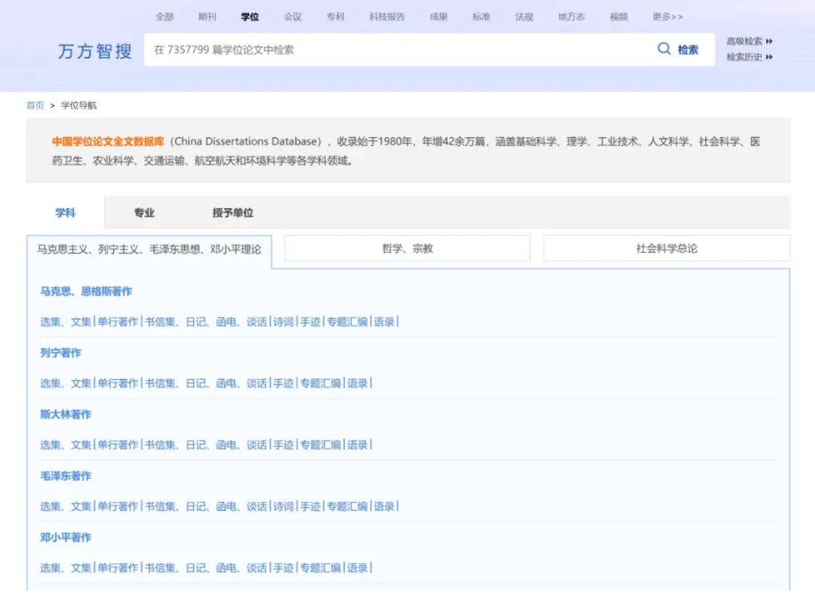 中国学位论文数据库(China Dissertations Database),收录始于1980年,涵盖基础科学、理学、工业技术、人文科学、社会科学、医药卫生、农业科学、交通运输、航空航天和环境科学等各学科领域。