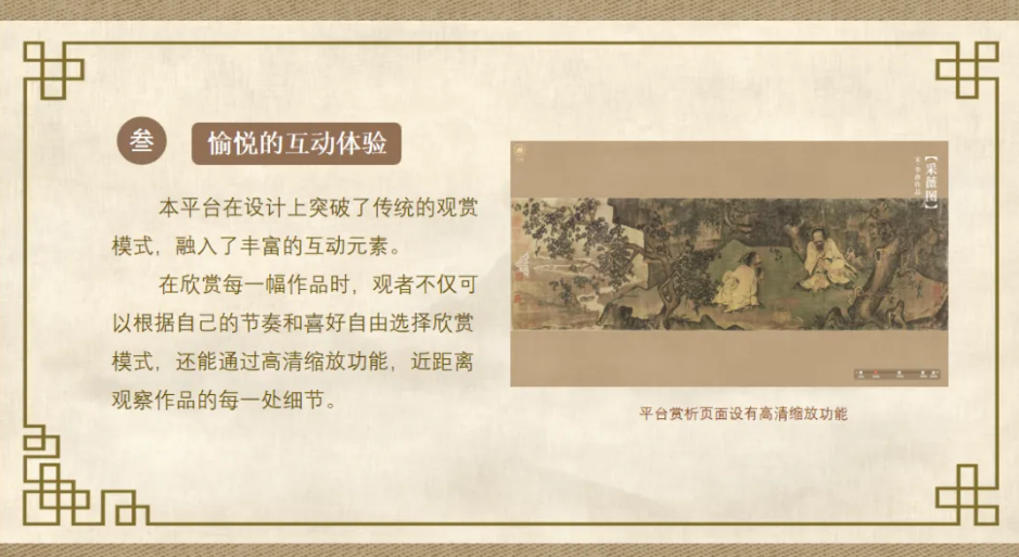 2.资源特色 ·千年珍品汇聚 “知识视界”中国书画赏析平台精心挑选了从魏晋至近现代近两千年间,中国历代大量珍贵书画作品。其中包括花鸟画、人物画和山水画等不同类别,每一位读者都能在这里找到自己感兴趣的作品。 ·解析详细生动 平台以旁白的形式对每一幅作品进行生动、细致的解说,还通过图文结合的形式,对创作者的生平、作品的创作背景、创作主题、艺术手法等方面作了详细的介绍。声情并茂的解说加上妙趣横生的图文内容,必将带给读者满满的收获。 ·更新持续不断 平台目前收录和品鉴大量传世名画,后续还将持续更新内容,展示更多优秀的艺术珍品,确保观者每次访问都能发现新的惊喜。 3.资源功能体验 ·极致的视觉享受 平台在网站设计和书画鉴赏设计上均不遗余力、力求完美,简约而不失雅致的界面风格,搭配高清精美的书画图片,将给读者带来极致的视觉体验。 ·方便的检索方式 平台精心构建了详尽的分类体系,不仅根据创作年代、创作题材对所有作品进行了细致的区分,而且还设置了快速检索功能,方便观者通过不同的方式迅速找到目标作品。 ·愉悦的互动体验 平台在设计上突破了传统的观赏模式,融入了丰富的互动元素。在欣赏每一幅作品时,观者不仅可以根据自己的节奏和喜好自由选择欣赏模式,还能通过高清缩放功能,近距离观察作品的每一处细节。
