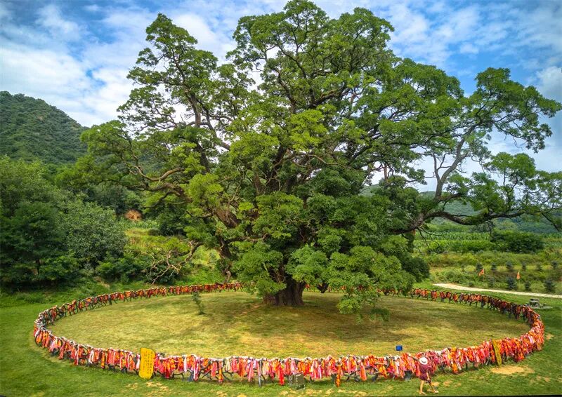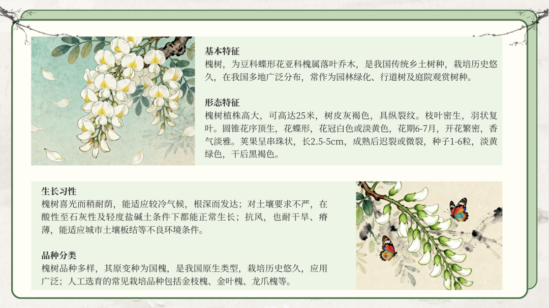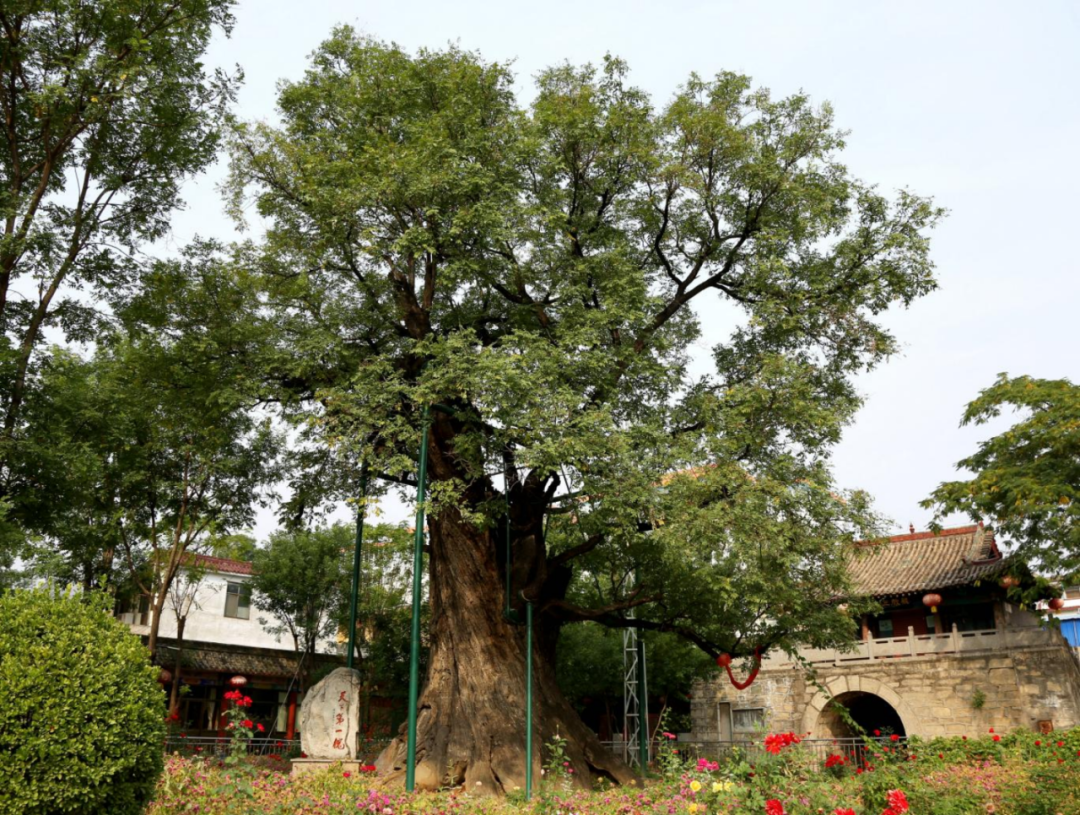 文学与艺术 诗词领域:槐树作为古典诗词中的常见意象,常被用来表达离愁别绪、家国情怀。唐代诗人岑参在《送韩巽入都觐省便赴举》中写道:“槐叶苍苍柳叶黄,秋高八月天欲霜。”借槐叶之苍,渲染送别之情。白居易的《庭槐》亦有“忽向天涯见,忆在故园时”之句,诗人在天涯之地见到槐树,便想起了故乡渭水上那棵荫蔽前墀的老槐,借槐树抒发了深沉的故园之思。 书画领域:槐树亦是画家笔下的常客。南宋佚名画家创作的《槐荫消夏图》,描绘盛夏槐树绿荫下一位文人袒胸赤足、仰卧休憩的悠然场景,展现出槐树下的人文气息与生活意境。清代戴衢亨创作的《夏槐八景册》以槐树为主体,描绘了《槐市横经》《槐黄试举》等八个与槐树相关的场景。画面笔墨干净,设色淡雅,夏槐绿荫如盖,触目所见,满纸清凉。 实用价值 观赏价值:槐树树形端正,枝叶繁茂,绿荫如盖,是优良的行道树和庭荫树。北京、西安、洛阳等古都的街头巷尾,常见百年古槐,成为城市历史文化的鲜活见证。每年夏季,槐花盛开,香气袭人,吸引蜂蝶成群,成为城市一道独特的风景线。 药用价值:槐花、槐米(花蕾)、槐角(果实)均可入药。槐花性凉,具有清热凉血、止血降压的功效,常用于治疗高血压、痔疮出血等症。槐角则有清肝明目、润肠通便之效。现代研究亦发现,槐花中富含芦丁等黄酮类物质,具有抗氧化、抗炎、降血脂等作用,广泛应用于中药制剂和保健品中。 04/赏景漫游 洪洞大槐树 位于山西省临汾市洪洞县的大槐树寻根祭祖园旅游景区,是国家5A级旅游景区。景区内有古槐数株,其中最著名者为明代移民遗址大槐树,树龄逾600年,枝繁叶茂,干粗需数人合抱。每年吸引大量游客与移民后裔前来寻根祭祖,已成为中华民族“根祖文化”的象征。 固新古槐 位于河北省邯郸市涉县固新镇的古槐树,素有“天下第一槐”之称。树龄逾2000年,位列中国现存十大古槐之一。古槐历经沧桑仍生机盎然,被视为长寿与祥瑞的象征,是华北地区古树文化的活化石。 崇信古槐王 “陇上有古槐,风华三千秋。”位于平凉市崇信县锦屏镇关河村的古槐树,被誉为“华夏古槐王”。树龄逾3200年,树高26米,胸径13米,枝干遒劲如龙,树冠若云。古槐与历史传说紧密相连,相传唐代名将尉迟敬德曾在此拴马,其独特的“一树三叶”奇观更为罕见,已成为黄土高原生态文化与中华文明源流的标志性景观。 古槐不语,绿荫长存。从周王宫的象征到寻常巷陌的守望,从科举仕途的寄托到游子寻根的信物,槐树以三千年苍劲风骨,承载着中华文明的集体记忆,成为镌刻在岁月里的文化符号。