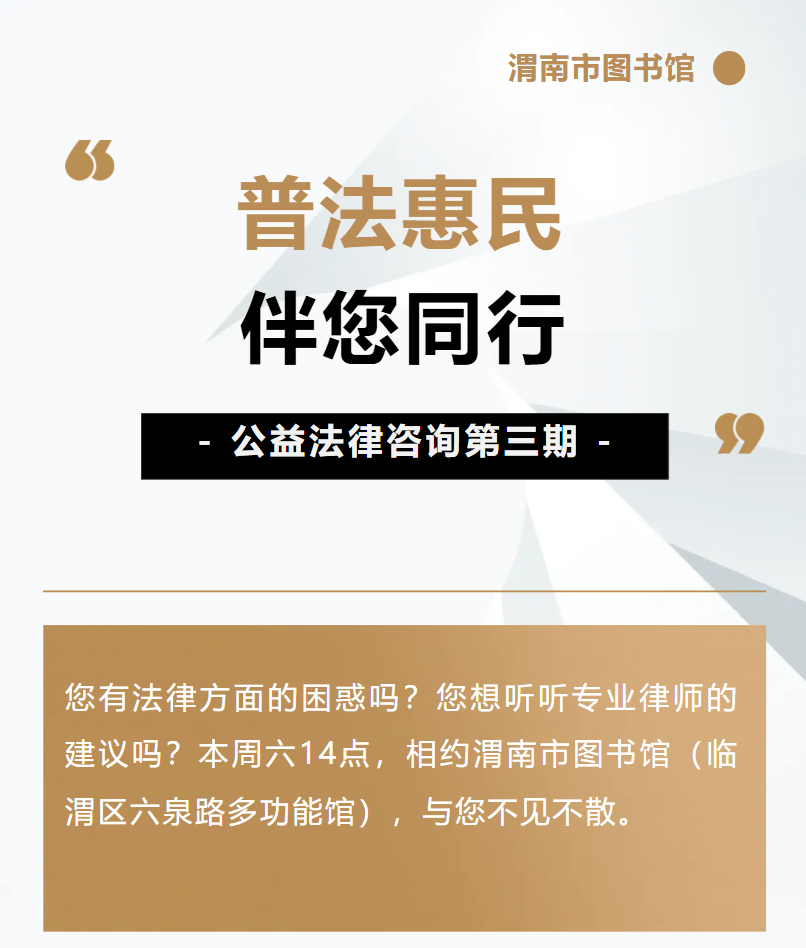 (一)主办单位 (二)活动时间 2025年11月22日 周六14:00——17:00 (三)活动地点 渭南市图书馆 陕西省渭南市临渭区六泉路中心西片区多功能馆 (四)活动形式 由专业的律师面对面为读者提供与日常生活息息相关的法律咨询、法律信息服务、法律宣传、法律讲座以及其他公益性法律服务等。
