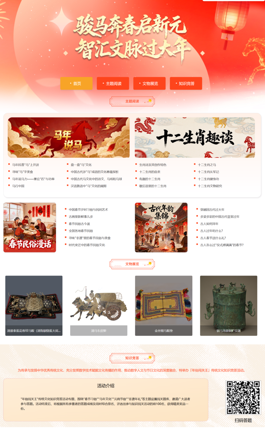 马年春节专题阅读活动页面已上线,内容包含“马年说马”科普、十二生肖趣谈、春节民俗漫话、古代年韵集锦、文物展览等内容,面向各馆读者通过PC端在线学习。