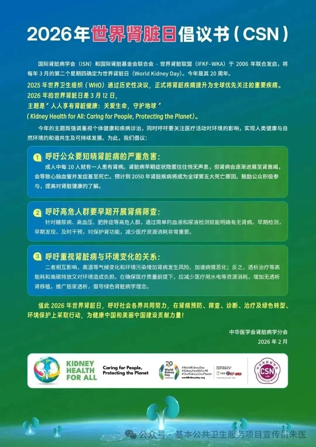 国际肾脏病学会和国际肾脏基金会联合会-世界肾脏联盟于2006年联合发启,将每年3月的第二个星期四确定为世界肾脏日。2026年3月12日是第21个世界肾脏日,今年宣传的主题是“人人享有肾脏健康:关爱生命,守护地球” 。今年的主题不仅仅是关注个人健康,同时呼吁关注地球环境,实现人类健康与自然环境的和谐共生及可持续发展。