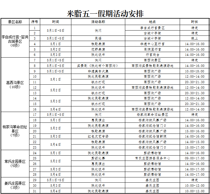 5月1日-5日,李自成行宫、窑洞古城、高西沟、杨家沟、常氏庄园、姜氏庄园等景区。