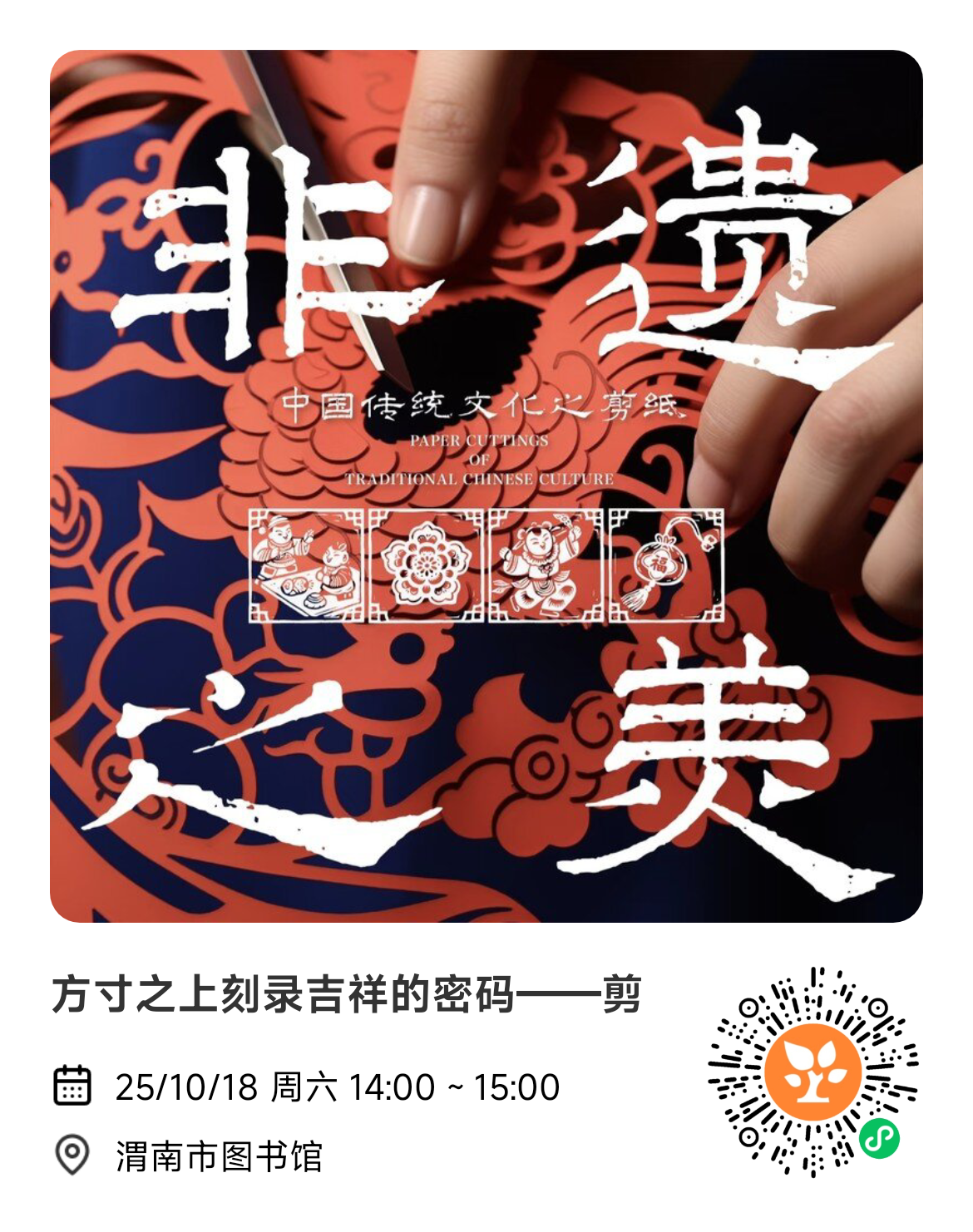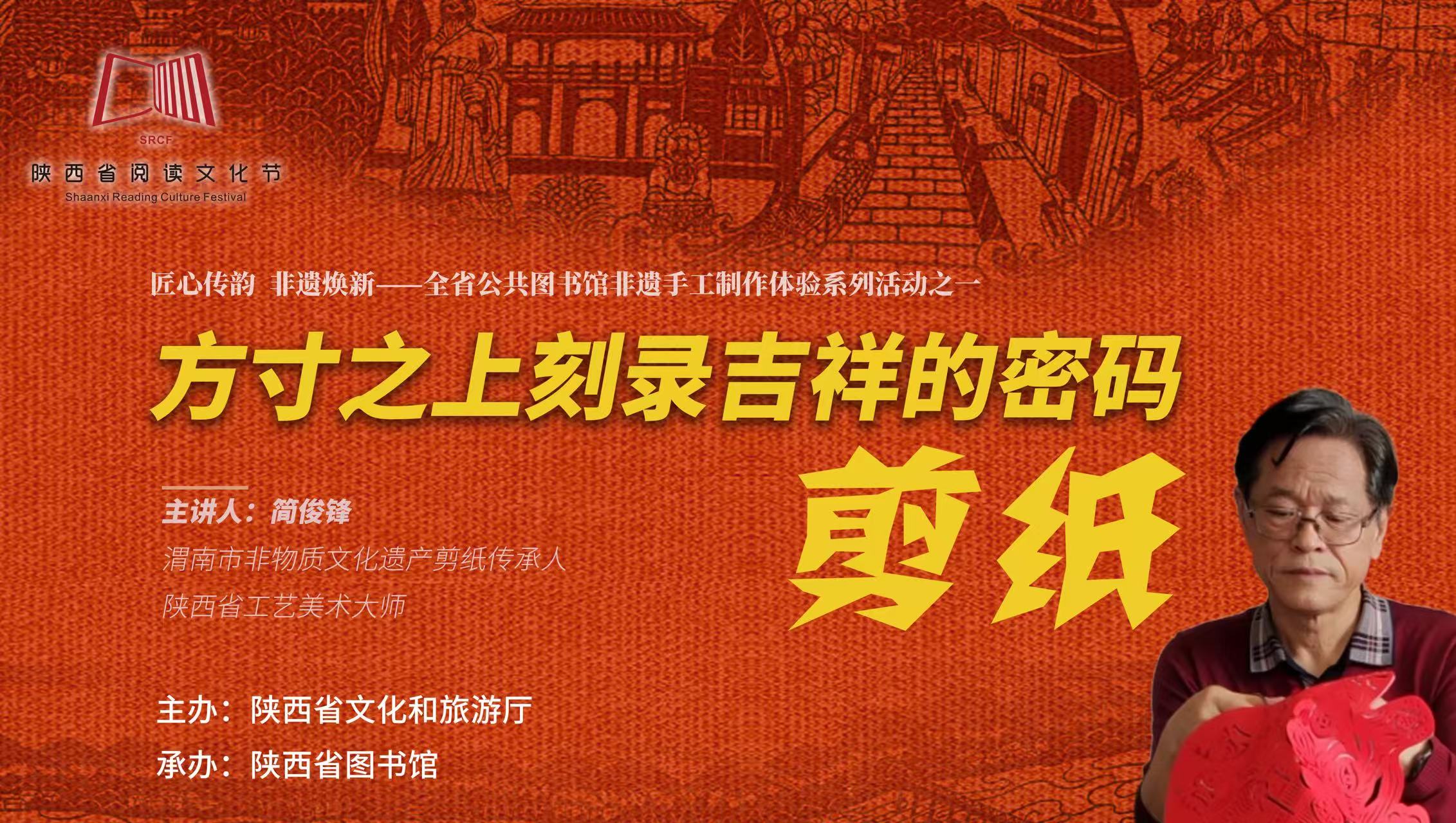 方寸之上刻录吉祥的密码——剪纸 10月18日(周六) 14:00—15:30 渭南市图书馆 主办:陕西省文化和旅游厅 承办:陕西省图书馆 协办:渭南市图书馆 所有读者 限60人(12岁及以下未成年需一名家长陪同) 1.读者签到 2.介绍非遗传承讲师 3.参与者领取剪纸材料 4.讲师授课 5.读者体验传统非遗剪纸(福字、十二生肖) 6.合影留念 1.现场报名:一楼总服务台 2.电话报名:2028303 樊老师 3.二维码报名 简俊锋,研究生学历,中共党员。现任中华文化促进会剪纸艺委会副秘书长、陕西省工艺美术学会剪纸专委会主任,系省工艺美术大师、渭南市非遗剪纸传承人。其代表作《武昌起义》《秦腔脸谱》《龙凤呈祥》等多次斩获全国及省市剪纸大赛金奖,曾九次在渭南组织中国渭南·全国剪纸精品邀请展,出版《中华剪纸·渭南专刊》等多部著作,在业界享有广泛声誉。 1. 活动现场将提供基础剪纸工具,也可携带个人常用工具参与。 2. 建议提前15分钟到场签到,活动期间请遵守场馆秩序。