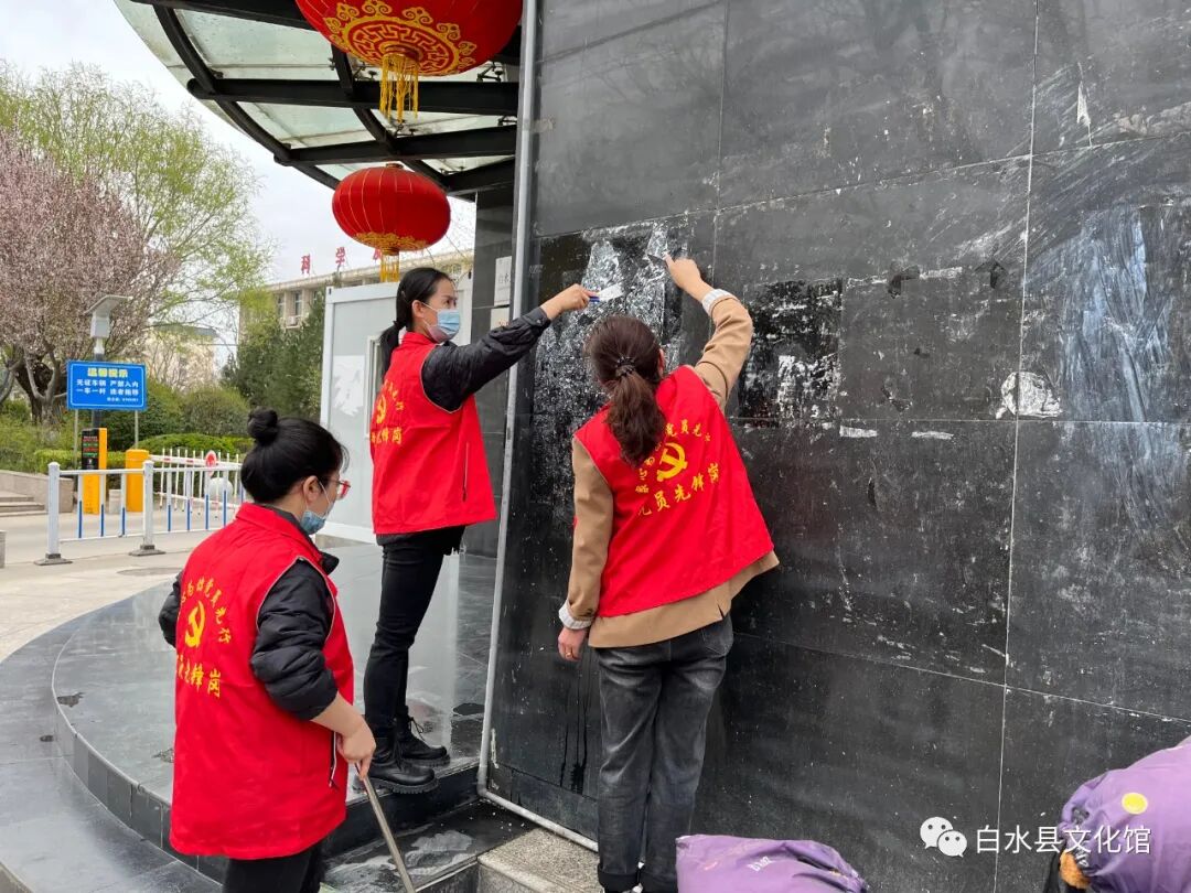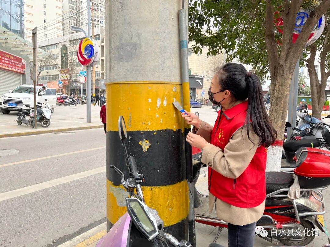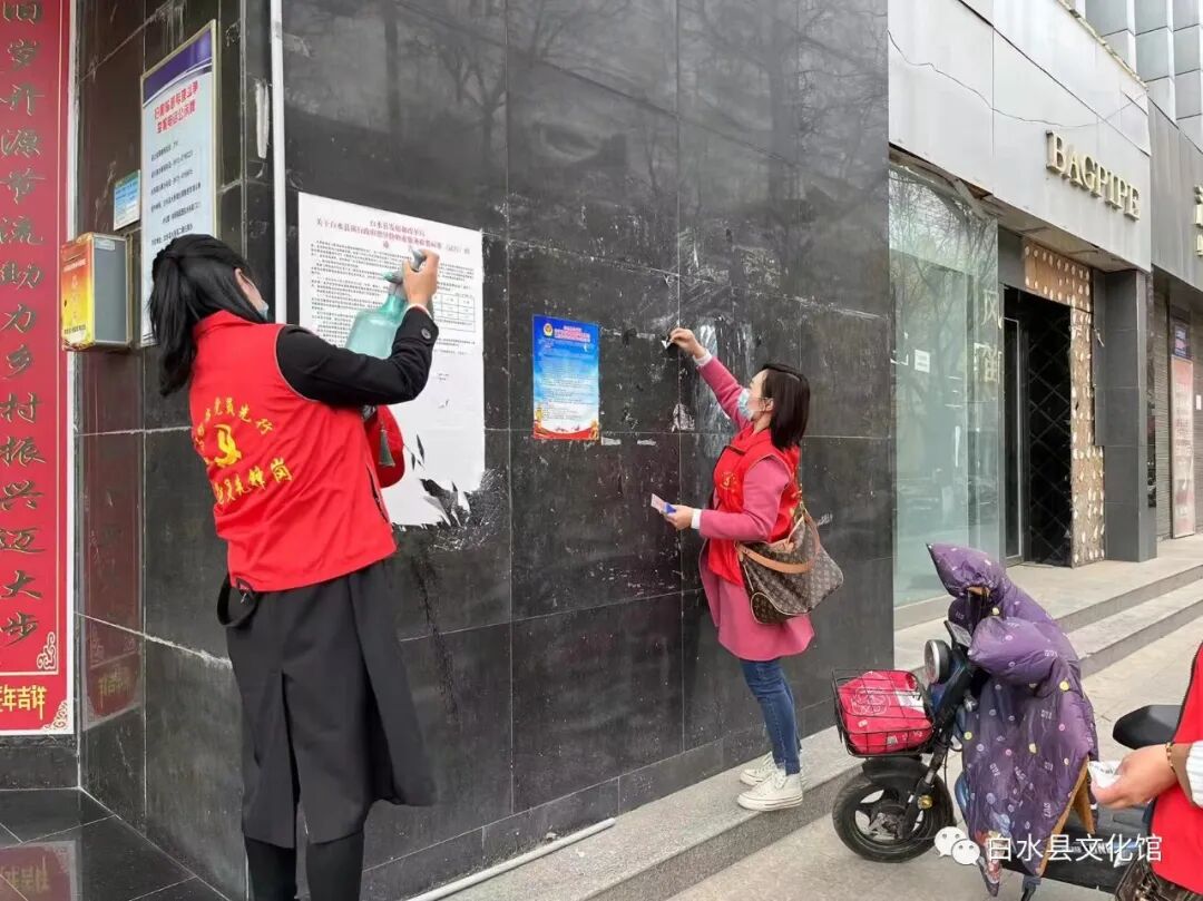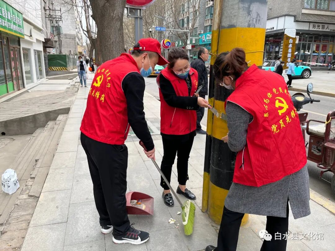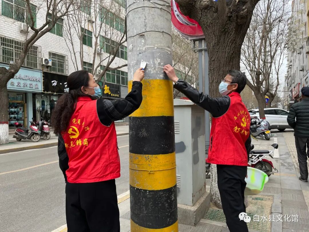 为改善城市环境,彻底清除小广告,3月30日下午,白水县文化馆组织党员干部参加泰山庙社区开展的清理卫生死角,铲除“牛皮癣”,美化城市环境主题活动。