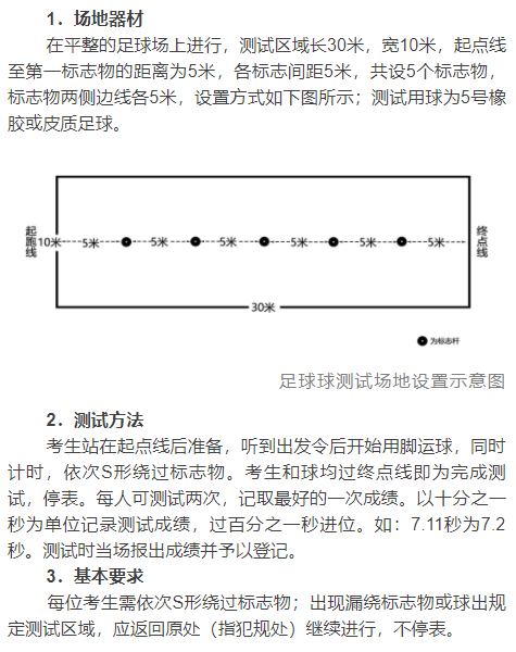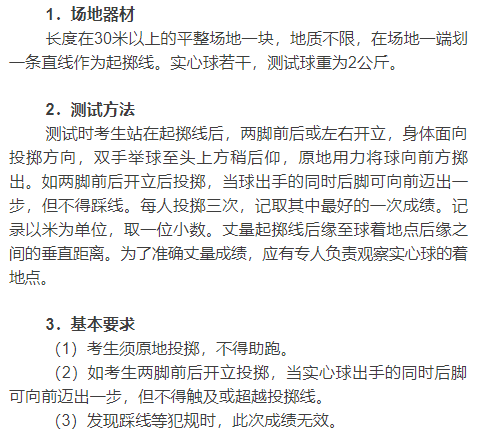 沙坑、丈量尺。沙面应与地面平齐,如无沙坑,可在土质松软的平地上进行。起跳线至沙坑近端不得少于30厘米。起跳地面要平坦,不得有坑凹。有条件的地区尽可能使用测试仪器进行考试。考生两脚自然分开站立,站在起跳线后,脚尖不得踩线(最好用置于地面的线绳做起跳线)。两脚原地同时起跳,不得有垫步或连跳动作。丈量起跳线后缘至最近着地点后缘的垂直距离。每人可跳三次,记取其中最好一次成绩。以米为单位,保留两位小数。(2)可以赤足,但不得穿钉鞋、皮鞋、塑料凉鞋参加测试。50米直线跑道若干条(符合田径比赛或测试需要),跑道线要清楚。提倡使用电子计时设备(以国家认定的电子计时设备使用说明为准)。若使用人工计时,需准备发令枪若干,秒表若干。秒表使用前,应用标准秒表校正,每分钟误差不得超过0.2秒,每小时误差不得超过0.3秒。考生至少两人一组测试。站立式起跑,当听到“各就位——鸣枪(跑)”开始起跑。计时应从发令枪的闪光或烟开始,直到运动员的躯干的任何部分抵达终点线后沿垂直平面的瞬间为止。以秒为单位记录测试成绩,精确到小数点后一位,小数点后第二位数按非“0”时则进1,如10.11秒读成10.2秒记录。(1)考生测试穿运动鞋或平底布鞋,赤足亦可。但不得穿钉鞋、皮鞋、塑料凉鞋。