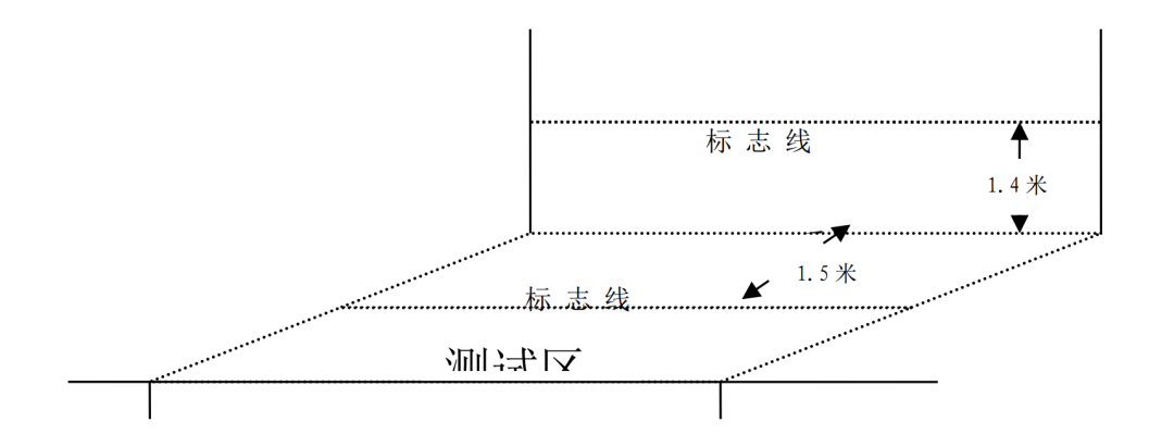 在墙面距地面高度1.40米处设一标志线;在地面距墙壁1.50米处划一标志线,设置方式如下图所示。测试用球符合排球规则中规定的比赛用球。考生站在地上标志线外,自己将球向上抛起(开始计时),连续对墙垫球。将球垫至墙面标志线以上,方能计数,反之不予计数。在垫球过程中,球落地由考生自行捡球并继续进行垫球,直至时间结束。测试时当场报出成绩并予以登记。