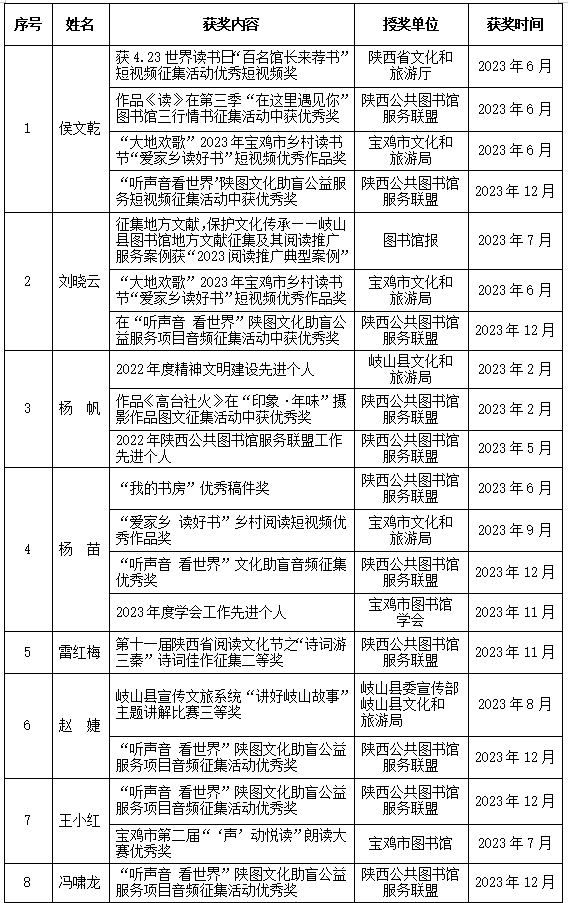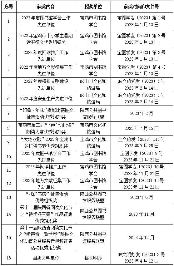 1月13日 被宝鸡市图书馆学会评为2022年度学会工作先进单位、阅读推广工作先进单位、地方文献征集工作先进单位、中小学生暑期读书征文工作先进单位,王小红同志被评为市图学会先进个人2月14日 被县文旅局评为2022年度精神文明建设先进单位、安全生产先进单位,刘晓云同志被评为优秀共产党员,雷红梅同志被评为先进工作者,杨帆同志被评为精神文明建设先进个人2月21日 省专家组和市评估小组对我馆进行全国第七次县级以上公共图书馆评估定级实地检查和复检3月1日 获得陕西省图书馆开展的“印象·年味”摄影图文征集活动优秀组织奖,读者樊宇卓、于永芳、苏雨涵、何亚娟、杨帆摄影作品获奖3月1日—4月20日 开展第31届“科技之春”宣传月文化活动, 共13项15场,包括参加县第三十一届“科技之春”宣传月活动启动仪式科普图书展览、步行街送图书志愿服务活动、科普知识线上推送、养生保健科普知识视频讲座、创意手工DIY(2场)、科普绘本故事会(2场)、科普图书展览推介、“码”上悦读:扫码读科普好书、智能手机使用公益培训、摄影知识讲座、“放飞好奇心,畅游脑洞科普乐园”科普文献推介展、“What if2”科普书目线上读书会、李勇年博士谈减肥科普视频推送3月14日 采购大型历史文献丛书《复兴文库》第一编至第三编共195册,并设立专架宣传推介3月15日 被县委文明办复评为县级文明单位(岐文明办发〔2023〕8号)3月20日 刘晓云撰写的《征集地方文献,保护文化传承—岐山县图书馆地方文献征集及其阅读推广服务案例》在《图书馆报》、贵州省图书馆联合开展的2023阅读推广典型案例征集活动中入选“2023阅读推广典型案例”4月1日—4月5日 开展“我们的节日—清明节”文化活动,共7项,包括红色图书线上线下推荐展、红色电影展播、“清明念故人,云上寄相思”线上朗诵、红色绘本讲读、清明节习俗和诗词线上推送、大型专题纪录片《绝笔》展播、革命先烈小故事线上推送活动4月10 日 上半年新购图书2071册,其中成人图书930册,少儿图书644册,流动图书435册,文津奖图书62册,馆藏图书达到119301册4月19日 侯文乾同志任岐山县图书馆党支部书记(岐文旅局党发〔2023〕31号文件)4月19日 在岐山县2023年“三秦书月·书香岐山”全民阅读月暨公共图书馆服务宣传周活动启动仪式上给9个镇级分馆、20个村和社区服务点分别流转新书15册,共计435册4月23日—5月23日 开展岐山县2023年“三秦书月·书香岐山”全民阅读月暨公共图书馆服务宣传周活动,共22项29场,包括岐山县2023年“三秦书月·书香岐山”全民阅读月暨公共图书馆服务宣传周活动启动仪式、诵读节目展演、阅读推广宣传展览、送书惠民,赵智宝先生著作《西岐戏苑》分享会,“我在新时代文明实践中心读好书”读书分享会,“文化进万家”送书下乡,分馆服务点管理员培训,新书荐读,第十八届文津图书奖获奖图书展,第二届“声动悦读”朗读大赛,第二届“在这里遇见你”图书馆三行情书展,第三届“在这里遇见你”图书馆三行情书征集,“书香岐山”阅读挑战赛,“码”上悦读,茅盾文学奖获奖者梁晓声作品推荐展览,“以书会友,悦享书香”读书分享会(成人场、少儿场),“我与图书馆的故事”征文比赛,“悦读·分享”绘本故事会,“我的书房”图文征集,“相约周末”影视播放,“书香沐初心,读书砥使命”系列活动(主题阅读、云上看展、名家谈经典、答题闯关),岐图手工坊“送给母亲的一束花”手工制作、“手绘风筝 放飞梦想”手工制作,志愿者服务4月24日 杨帆同志被陕西公共图书馆服务联盟评为2022年度联盟工作先进个人(陕公图联发〔2023〕5号文件)6月12日 采购《元圣周公全传》470册流转至镇村和社区图书室、农家书屋6月20日—6月25日 开展“我们的节日—端午节”系列文化活动,共7项,包括“我们的节日—端午节”集中示范送书宣传、“诗意端午,家国情深”经典诗文诵读、端午节手工挂饰制作、线上推送端午节知识、经典诗文、讲绘本故事和诗文诵读活动6月20日—7月31日 举办以“强化阅读引领 助力乡村振兴”为主题的“大地欢歌”2023年岐山县乡村读书节活动,共4项,包括遴选乡村阅读推广人参加全市集中展示和阅读推广人培训、乡村阅读推广活动优秀成果图片展、“爱家乡 读好书”乡村阅读短视频征集、流动图书进乡村活动。6月30日 续购超星读书小程序,丰富馆藏数字资源,该数字资源包含电子书3.8万册,期刊3000种,讲座资源1万集,绘本1000部,听书7万集,资源量为6.42TB7月10日—8月31日 举办“夏日书香”暑期系列文化活动。共25项42场,其中线下37场,线上5场,包括文化志愿服务4期、“爱心助成长 合力护书香”志愿服务、信息写作讲座、第十八届中小学生暑期读书征文、图书馆“三行情书”线上展、送书14次(给9个镇级分馆、106个农家书屋、16个社区图书室送书556册,给武警中队送书100册,给消防救援大队送书100册,给残联文化服务中心送报刊)、百部经典图书线上线下推荐展览、读书挑战赛、“码”上悦读、2023年新征地方文献展、“以书会友 悦享书香”读书交流会、“岐小图”讲绘本、绘本故事会3期、“颂军魂 感党恩”庆八一诗文诵读、少儿读者读书交流会、暑期优秀影视展播、暑期青少年计算机培训、数字资源使用培训、“诗意四季”诗配画征集比赛、“我领读”志