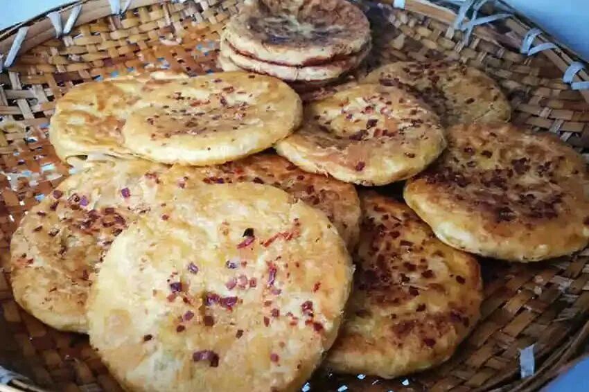 正宗的丽江粑粑,有一道特殊的手艺:先将本地的面粉加入碱和上水,发酵过后,放在擀面的案板上反复揉捏,抹上炼好的猪油把面擀成很多层,多以肉和糖为馅,拌以细葱,配上佐料和盐。擀成巴掌大的圆饼,用平底的油锅反复煎黄,边煎边淋菜籽油。