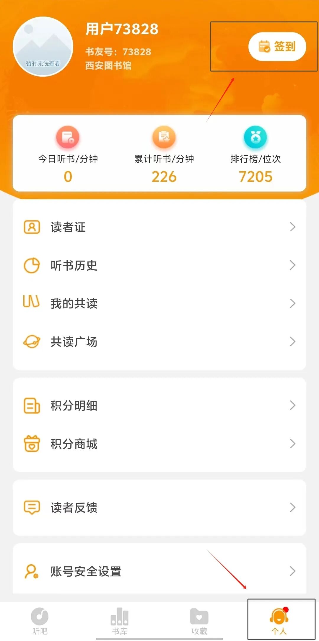 打开【懒人听书】→点击【个人】→右上角【签到】之后就可以挑选喜欢的书啦。