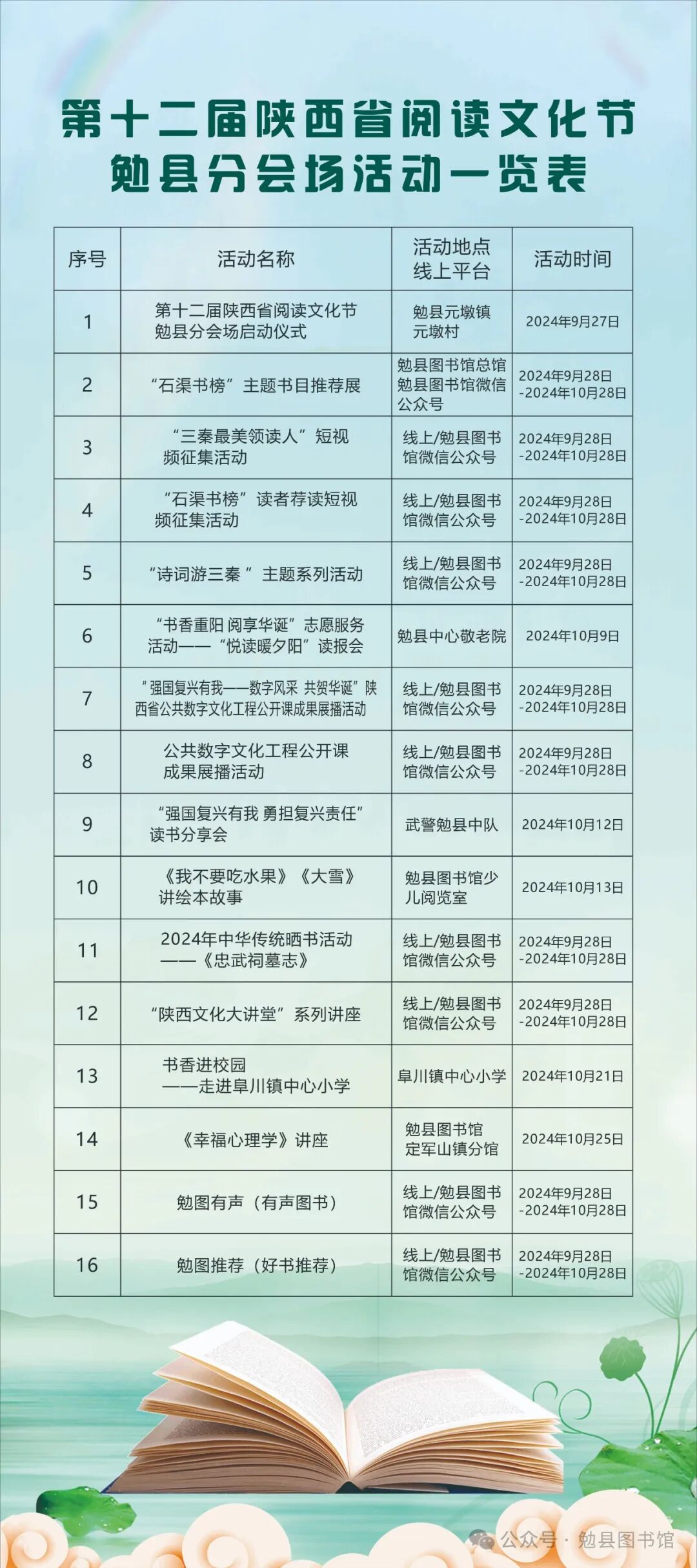 阅读文化节丨第十二届陕西省阅读文化节勉县分会场系列活动一览表