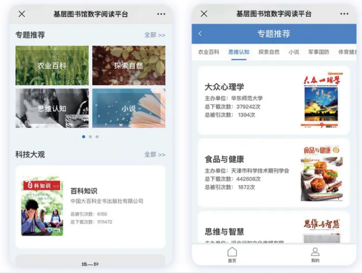 基层图书馆数字阅读平台在精选数字资源基础上,提供了经典文学、热门视频、科普读物等各种群众喜闻乐见的电子资源配置服务,能够使读者更广泛地了解各类知识,拓展阅读边界,丰富图书馆的公共文化资源体系。此外,还可以根据图书馆的需求,对中国知网的全库资源进行分门别类的内容配置。