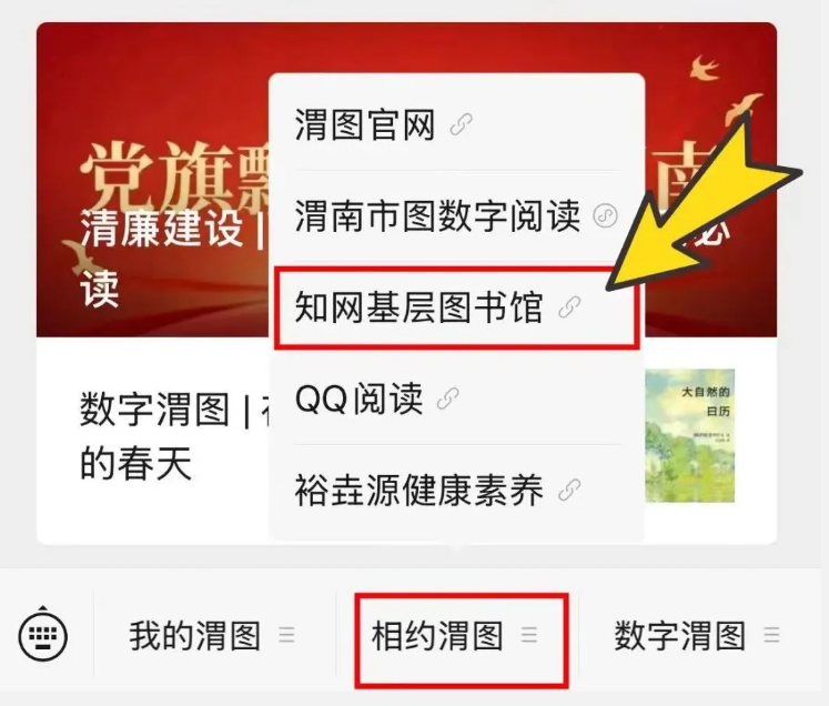 一、关注【渭南市图书馆】官方公众号,点击导航栏 【相约渭图】 →【知网基层图书馆】
