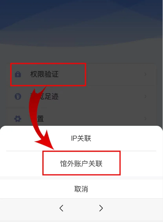 三、注册登录后,在“我的”界面,点击权限验证——馆外账户关联 输入渭南市图书馆账号: