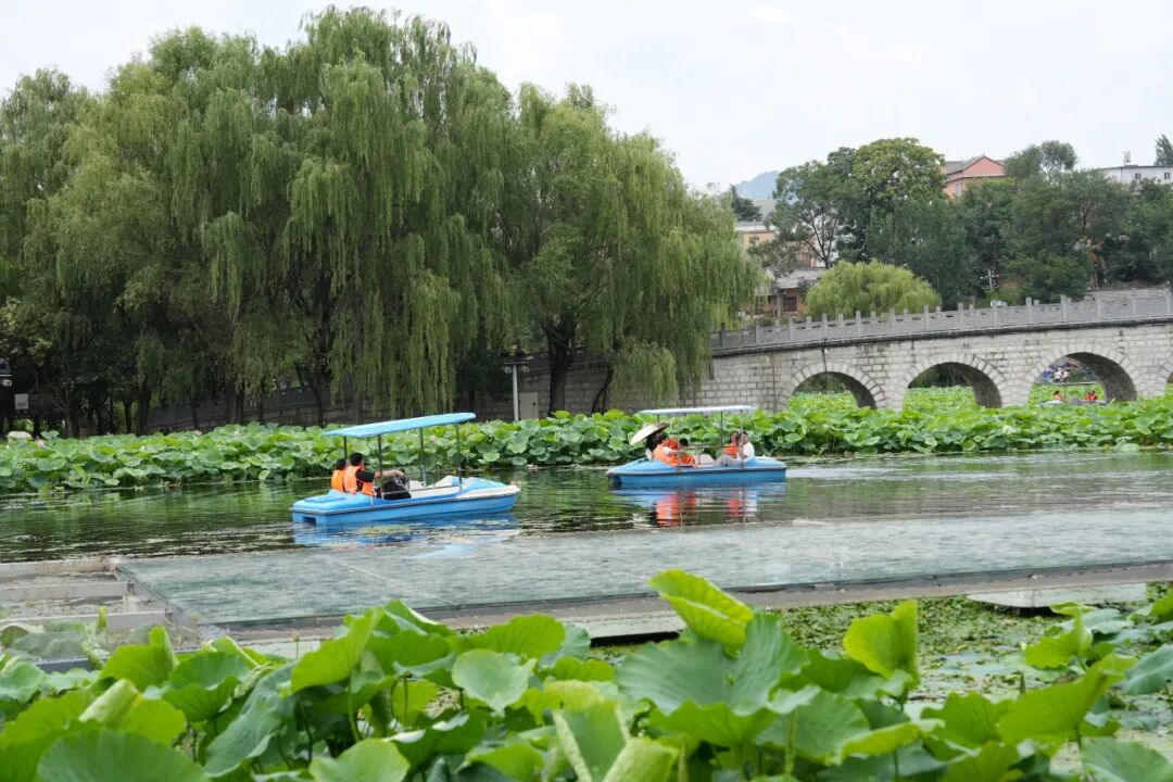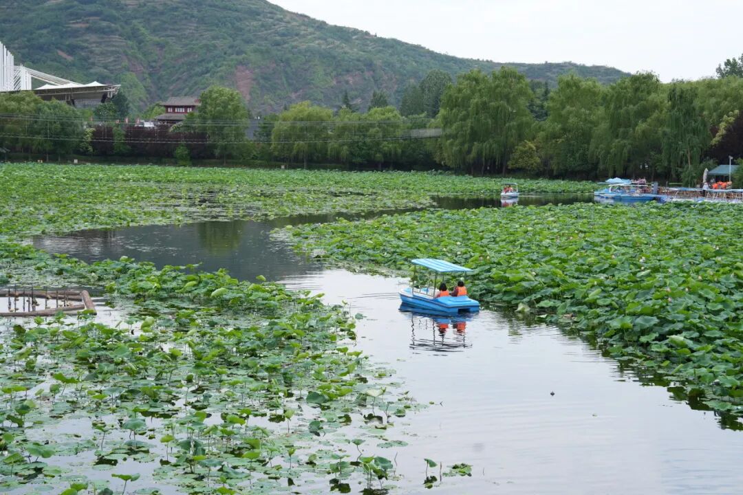 邀你共赴一场古韵悠然的诗意之约! 初夏的风,温柔地拂过棣花古镇, 绿意正以蓬勃的姿态肆意生长, 将这片灵秀之地晕染成 一幅浓淡相宜的水墨画卷。 而最令人心动的信号, 已悄然浮现在湖面之上——荷花, 正渐渐冒出了头! 一朵朵粉白娇嫩的花苞,如羞涩的少女,含苞待放。它们亭亭玉立于碧绿的莲叶之间,尖尖角上还挂着晶莹的晨露,在阳光下折射出剔透的光彩。这初露的生机,是夏日最动人的序章。 此时,还有什么比泛舟湖上更惬意的事呢?快来划船吧!轻舟摇曳,穿行绿意,驶入碧波之中。舟行之处,荡开圈圈涟漪,近距离欣赏那些初露尖角的荷花,感受那份呼之欲出的生命力。看圆润的荷叶铺满水面,随风轻舞,带来阵阵清新的荷香。此刻的静谧与期待,本身就是一种享受。 棣花的初夏,不仅美在景,更乐在人!漫步其间,处处洋溢着轻松愉悦的氛围,游客服务中心旁,传来阵阵欢笑与喝彩!原来是一群兴致盎然的游客正自发组织跳大绳!长绳翻飞,身影跃动,无论是重温童年记忆的大朋友,还是初次尝试的小朋友,那份纯粹的快乐极具感染力,让人忍不住驻足加油或加入其中! 还有游客大方地拿起话筒,即兴高歌一曲。悠扬的旋律随风飘荡,可能是流行的节奏,也可能是婉转的古风小调,为这如画风光增添了灵动的背景音。说不定下一个拿起话筒的,就是你! 游人如织的热闹景象,为棣花景区更添一份生机与活力。大家或驻足赏荷,或笑语泛舟,或寻觅最佳角度打卡,共同构成了棣花初夏最生动的风景线。 趁绿意正浓,古韵正醇, 欢乐正盛! 这个夏天, 不必远行,来棣花景区吧!
