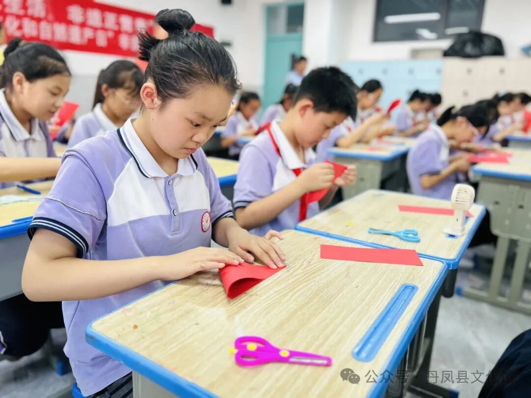 6月11日,市级非遗丹凤剪纸走进丹凤县第一小学。丹凤剪纸传承人黄战兵老师,为学生们现场展示了上百种剪纸作品。课堂上,黄老师带领学生们现场进行剪纸,第一个内容:剪五角星。在黄老师的带领下,同学们跟着老师的口令,一步一步地认真折、画、剪。当完成最后一步,学生们小心翼翼地打开,一幅幅鲜红的五角星呈现在眼前,一颗颗闪闪的红星,照出了学生们成功的喜悦,照亮了孩子们充满希望的未来。第二个内容:团花。在黄老师的指导下,学生们很快进行了简单的折纸,然后开始剪不同的元素,黄老师边讲边示范,同学们边看边照样剪。最后,每个人剪出来的团花都不完全一样,同学们眼里充满的是惊喜,是喜悦,是对剪纸的喜爱,这就是剪纸的魅力。