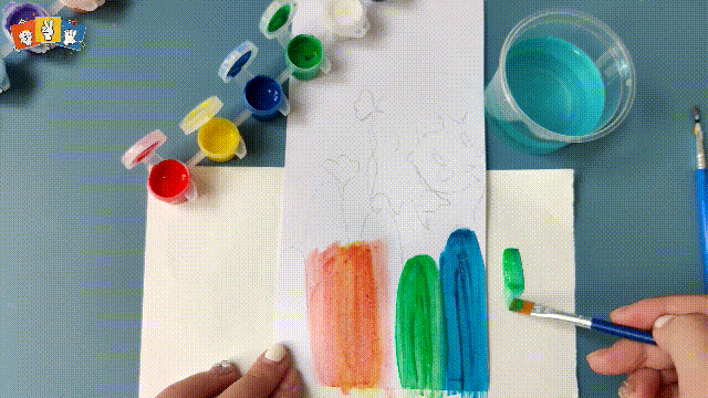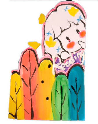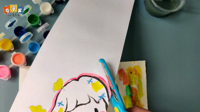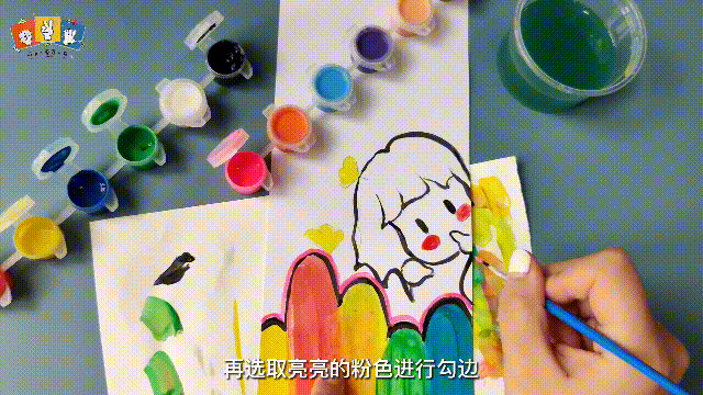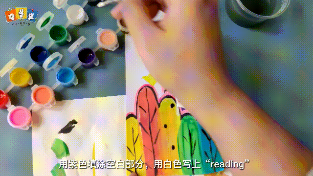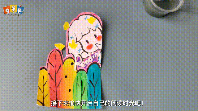 铅笔、颜料、笔刷、白色卡纸、剪刀(备用) —1— 用铅笔简单几笔勾勒出底稿 —2— 蘸取颜料开始给植物部分上色 —3— 蘸取黑色颜料进行勾边 —4— 简单涂一下小女孩形象 像不像正在思考的你 —6— 再选取亮亮的粉色进行勾边 —7— 用黑色、黄色蓝色进行点缀装饰 —8— 用紫色填涂空白部分,用白色写上“reading” —9— 晾于后剪下来,炫彩书签做好啦 —10— 接下来愉快开启自己的阅读时光吧!