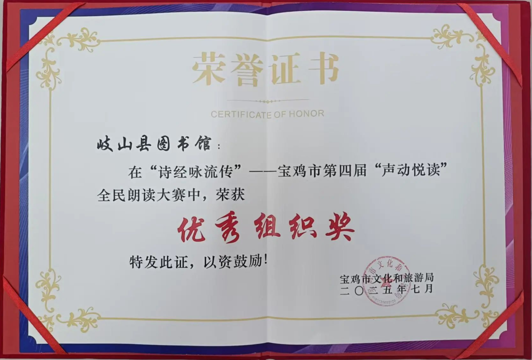 近日,由宝鸡市文化和旅游局主办,宝鸡市图书馆、宝鸡市新华书店、宝鸡市融媒体中心音乐广播承办,各县区图书馆协办的宝鸡市第四届“‘声’动悦读”朗读大赛圆满落幕。这场历时两个多月的赛事,经过初赛、复赛、决赛的层层比拼,于7月18日正式收官。岐山县图书馆选送的8名读者在全市决赛中表现优异,分别斩获一二三等奖及优秀奖,岐山县图书馆获得优秀组织奖。