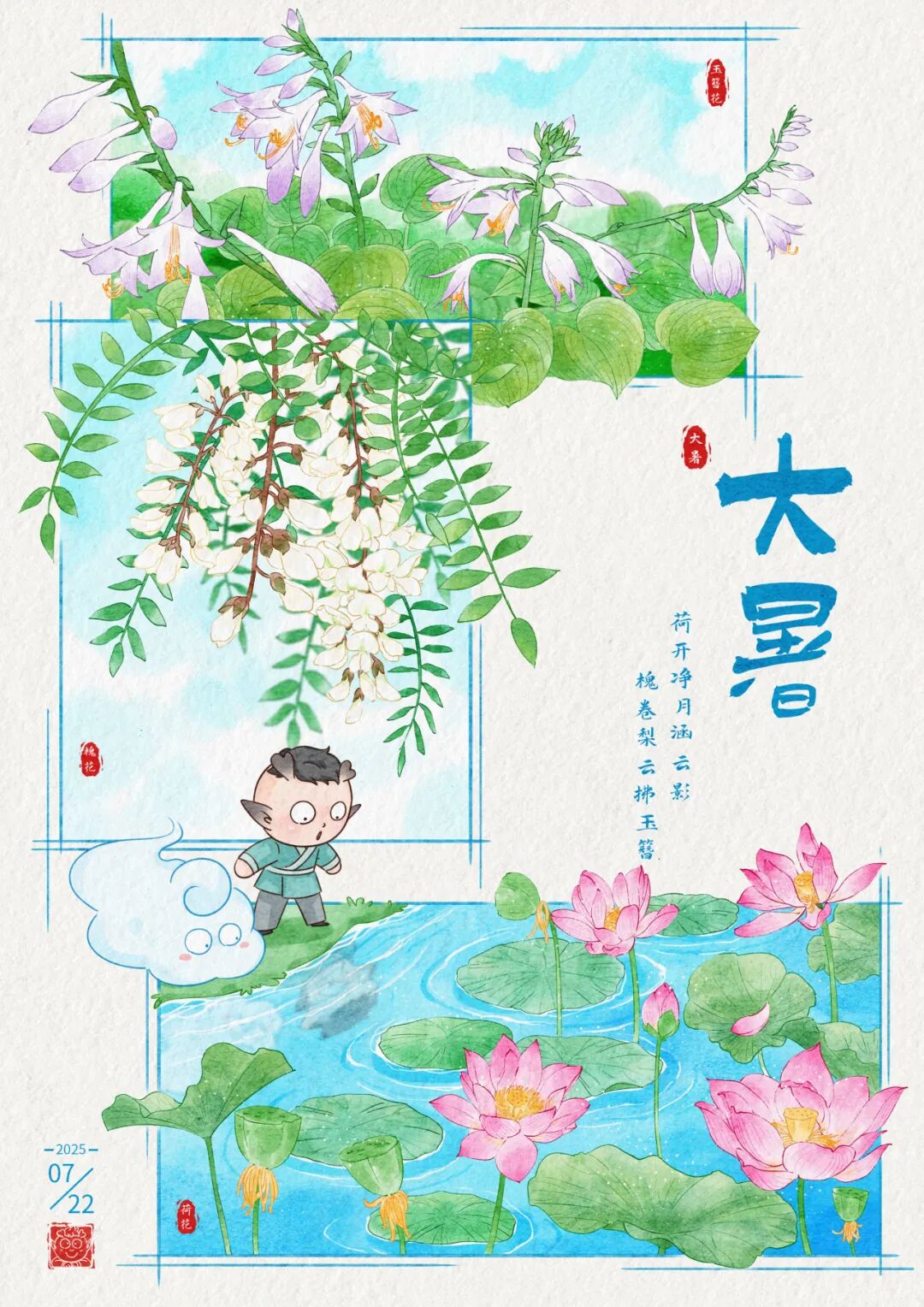 大暑,“大暑,六月中。暑,热也,就热之中分为大小,月初为小,月中为大,今则热气犹大也。”《月令七十二候集解》精准勾勒出此时的气候特征。在我国大部分地区,大暑是一年中最热的时段,然而,这份酷热并非只有焦灼难耐,在它的裹挟下,大自然以一种更为浓烈的姿态绽放着生命力。 古人将大暑分为三候:“一候腐草为萤;二候土润溽暑;三候大雨时行。”大暑时节,养生的关键在于 “防暑降温、祛湿养心”。在南方许多地区,大暑有 “晒伏” 的传统。