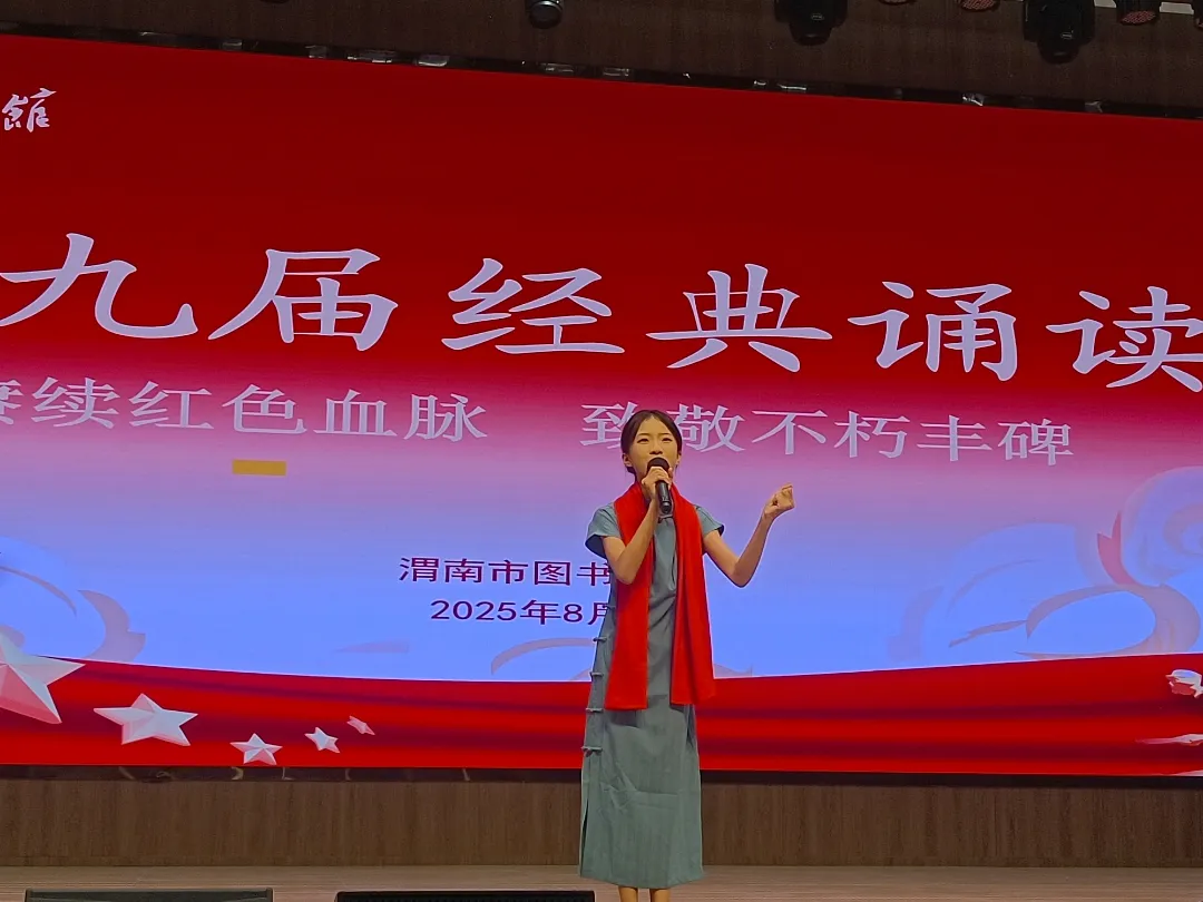 为传承红色基因、弘扬经典文化,8月16日,渭南市图书馆第九届经典诵读活动如期举行。本次活动以“赓续红色血脉 致敬不朽丰碑”为主题,吸引了少儿、青少年、成人三个组别共98名参与者报名,经前期筛选,最终48人登台参赛。大家通过诵读经典诗文、爱国篇章、廉洁故事、红色故事及红色诗歌等作品,在抑扬顿挫的声韵中共同感悟不朽精神,让红色文脉在传承中焕发时代光彩。
