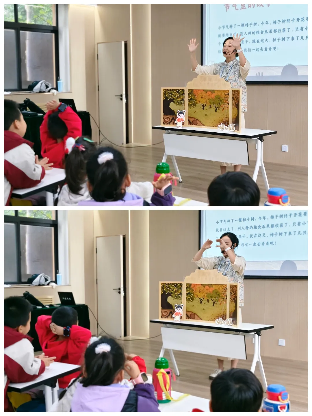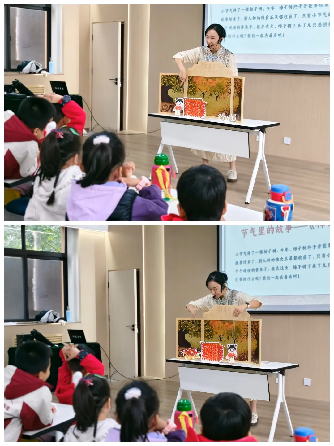 随后,一起学唱《霜降》童谣:“草木叶落黄,节气到霜降。豺狼忙捕猎,蛰虫打洞藏。柿子挂树梢,红光闪闪亮。摘下口里尝,心里甜又香。”清脆的童声回荡,仿佛把秋意揉进了每一个字里行间,也成功引出今天的国潮故事《柿柿顺心》。