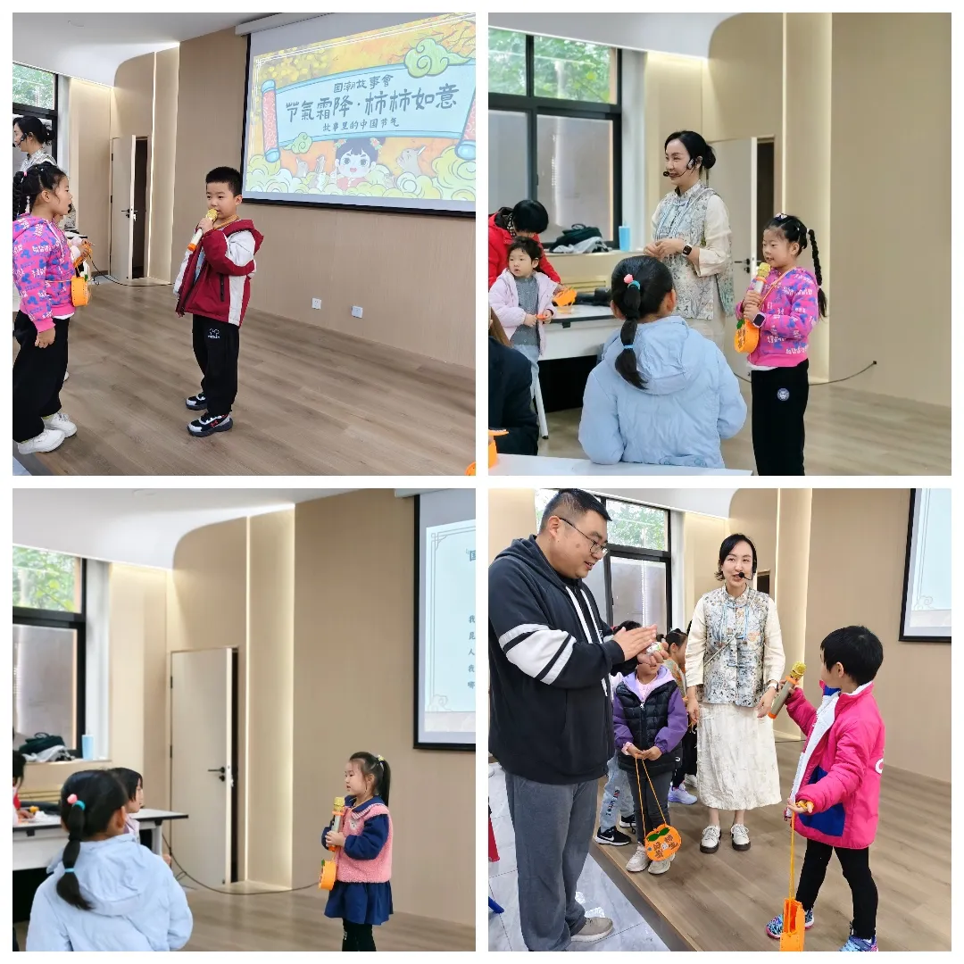 心宇老师打开小朋友们喜爱的故事盒子,娓娓道来:小节气种了棵柿子树,秋天她去树下等柿子红,突然来了一群豺狼,想要吃掉小动物们。小节气和豺狼约定拿出玲珑剔透心,它们就放过小动物。动物们很担心,想要找到玲珑剔透心。动物们在小节气的带领下摘柿子、削皮、晒柿子,最后做成了晶莹剔透的柿饼,在豺狼来时交给了它们,豺狼也遵守约定……故事讲完,小朋友们听得入神,眼中闪烁着对知识的好奇与向往。